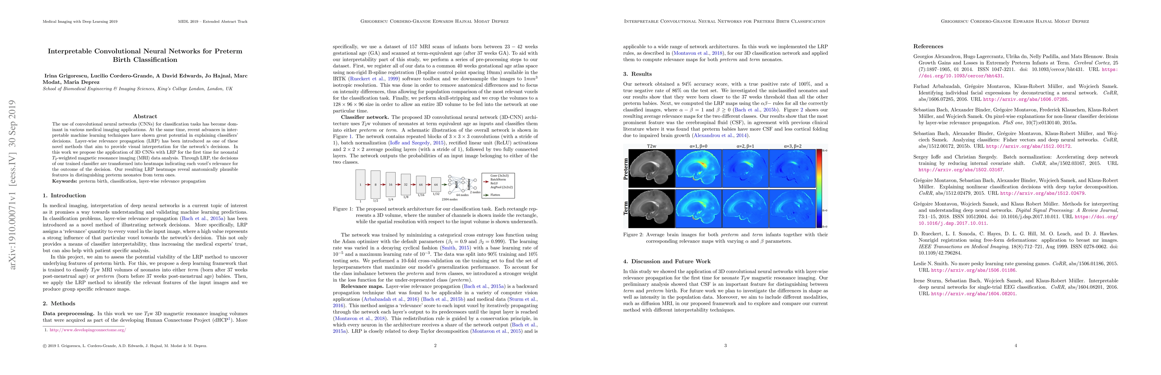 This paper proposes a novel application of 3D convolutional neural networks (CNNs) combined with layer-wise relevance propagation (LRP) to classify neonatal T2-weighted MRI data for preterm birth prediction. The LRP method generates heatmaps that visually interpret the network's decisions, highlighting anatomically relevant features for distinguishing preterm from term neonates.