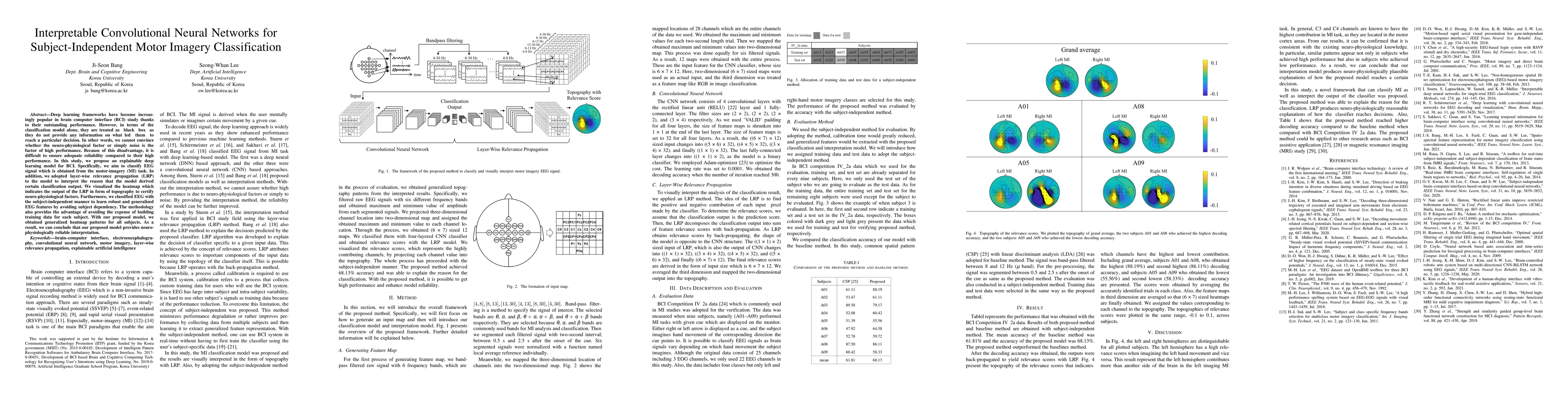 Deep learning frameworks have become increasingly popular in brain computer interface (BCI) study thanks to their outstanding performance. However, in terms of the classification model alone, they are treated as black box as they do not provide any information on what led them to reach a particular decision. In other words, we cannot convince whether the high performance was aroused by the neuro-physiological factors or simply noise. Because of this disadvantage, it is difficult to ensure adequate reliability compared to their high performance. In this study, we propose an explainable deep learning model for BCI. Specifically, we aim to classify EEG signal which is obtained from the motor-imagery (MI) task. In addition, we adopted layer-wise relevance propagation (LRP) to the model to interpret the reason that the model derived certain classification output. We visualized the heatmap which indicates the output of the LRP in form of topography to certify neuro-physiological factors. Furthermore, we classified EEG with the subject-independent manner to learn robust and generalized EEG features by avoiding subject dependency. The methodology also provides the advantage of avoiding the expense of building training data for each subject. With our proposed model, we obtained generalized heatmap patterns for all subjects. As a result, we can conclude that our proposed model provides neuro-physiologically reliable interpretation.