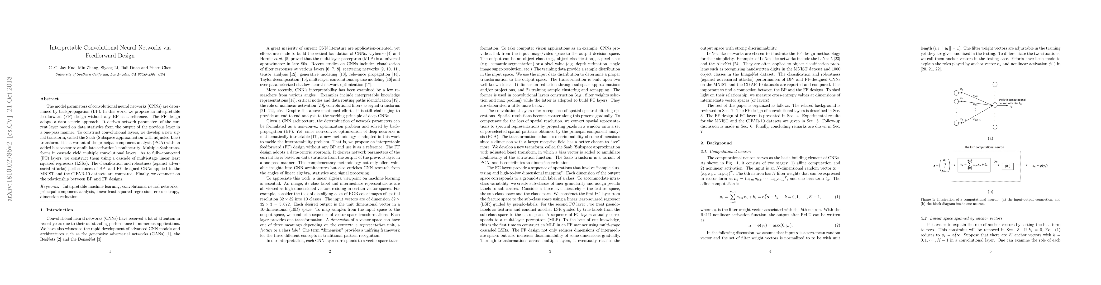 This paper proposes an interpretable feedforward design for CNNs that avoids backpropagation, using a data-centric approach with a Saab transform for convolutional layers and multi-stage linear least squared regressors for fully-connected layers. The performance of this design is compared to traditional backpropagation-trained CNNs on MNIST and CIFAR-10 datasets.