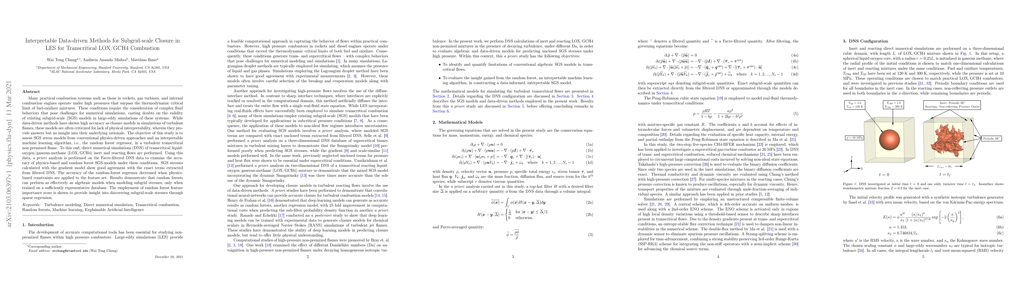 Many practical combustion systems such as those in rockets, gas turbines, and internal combustion engines operate under high pressures that surpass the thermodynamic critical limit of fuel-oxidizer mixtures. These conditions require the consideration of complex fluid behaviors that pose challenges for numerical simulations, casting doubts on the validity of existing subgrid-scale (SGS) models in large-eddy simulations of these systems. While data-driven methods have shown high accuracy as closure models in simulations of turbulent flames, these models are often criticized for lack of physical interpretability, wherein they provide answers but no insight into their underlying rationale. The objective of this study is to assess SGS stress models from conventional physics-driven approaches and an interpretable machine learning algorithm, i.e., the random forest regressor, in a turbulent transcritical non-premixed flame. To this end, direct numerical simulations (DNS) of transcritical liquid-oxygen/gaseous-methane (LOX/GCH4) inert and reacting flows are performed. Using this data, a priori analysis is performed on the Favre-filtered DNS data to examine the accuracy of physics-based and random forest SGS-models under these conditions. SGS stresses calculated with the gradient model show good agreement with the exact terms extracted from filtered DNS. The accuracy of the random-forest regressor decreased when physics-based constraints are applied to the feature set. Results demonstrate that random forests can perform as effectively as algebraic models when modeling subgrid stresses, only when trained on a sufficiently representative database. The employment of random forest feature importance score is shown to provide insight into discovering subgrid-scale stresses through sparse regression.
