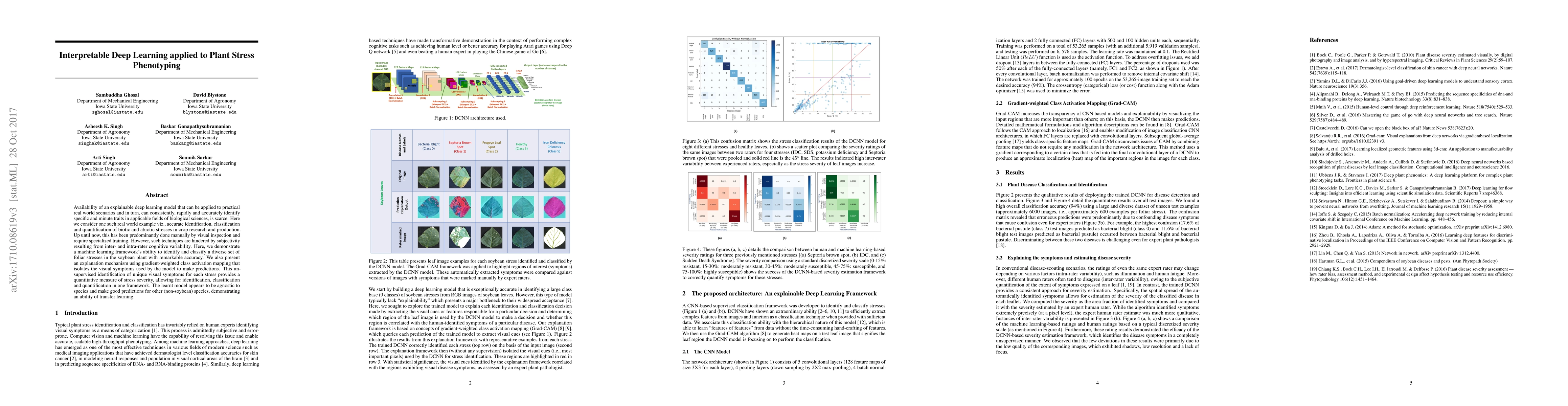 This paper presents an interpretable deep learning model for identifying and classifying biotic and abiotic stresses in soybean plants, using gradient-weighted class activation mapping to explain visual symptoms. The model demonstrates transfer learning capabilities, accurately predicting stress in other plant species.