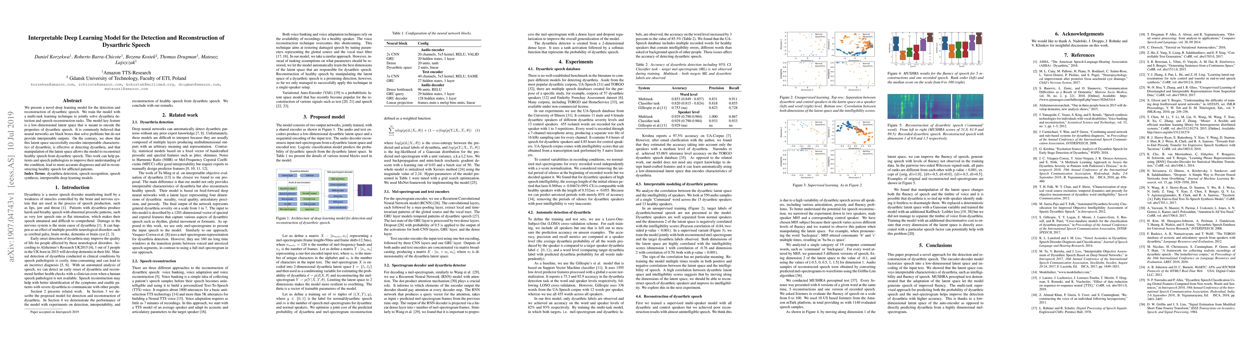 This paper introduces an interpretable deep learning model for detecting and reconstructing dysarthric speech, utilizing an encoder-decoder framework that reveals latent speech characteristics. The model's latent space enhances fluency and accuracy in dysarthria detection through a multi-task supervised approach.