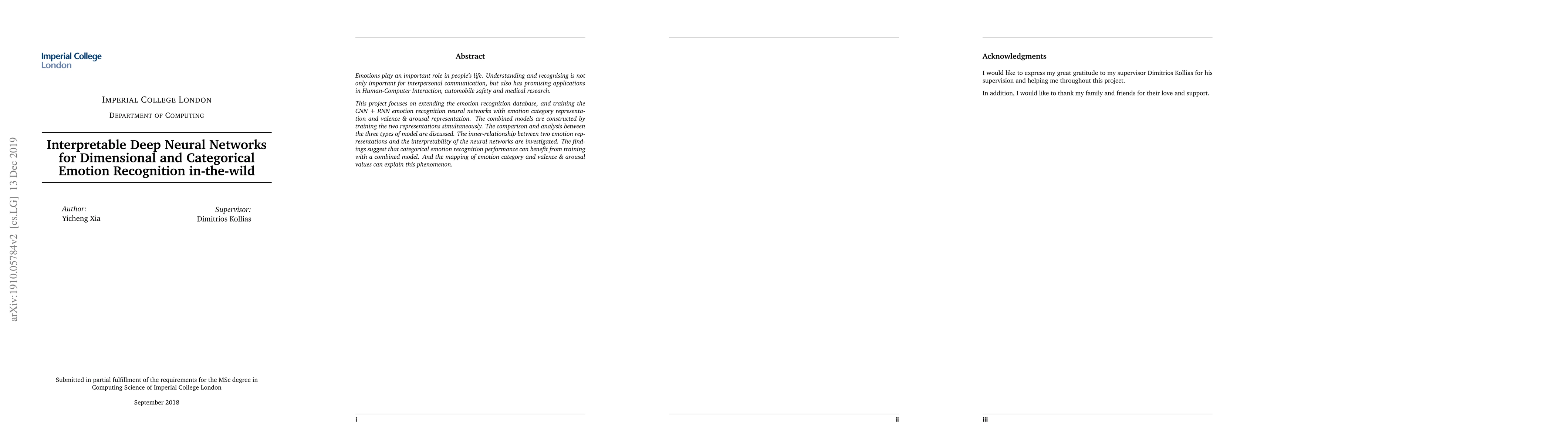 Emotions play an important role in people's life. Understanding and recognising is not only important for interpersonal communication, but also has promising applications in Human-Computer Interaction, automobile safety and medical research. This project focuses on extending the emotion recognition database, and training the CNN + RNN emotion recognition neural networks with emotion category representation and valence \& arousal representation. The combined models are constructed by training the two representations simultaneously. The comparison and analysis between the three types of model are discussed. The inner-relationship between two emotion representations and the interpretability of the neural networks are investigated. The findings suggest that categorical emotion recognition performance can benefit from training with a combined model. And the mapping of emotion category and valence \& arousal values can explain this phenomenon.