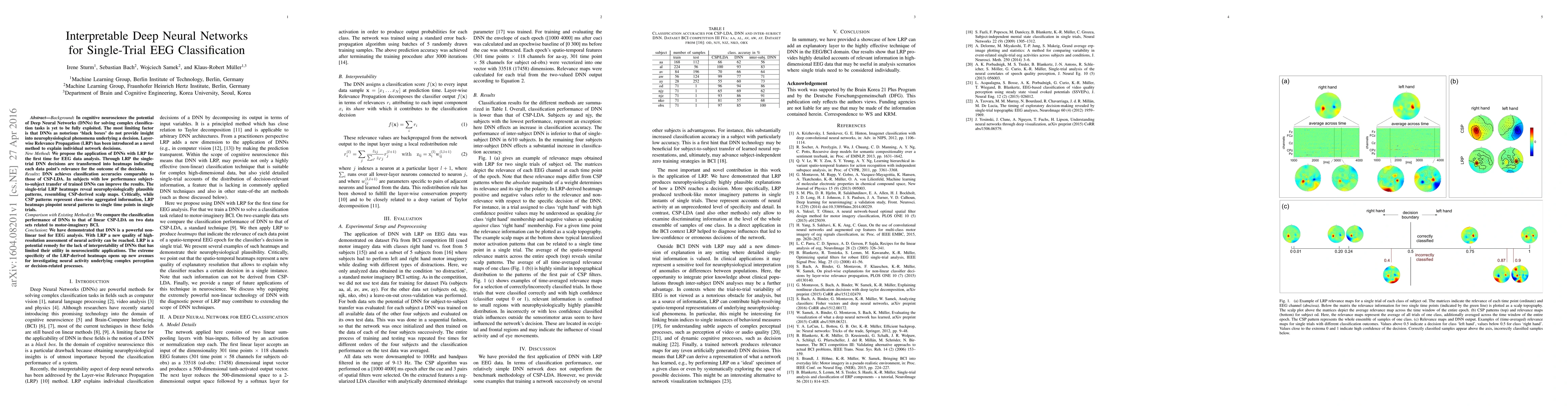 This paper proposes using Deep Neural Networks (DNNs) with Layer-wise Relevance Propagation (LRP) for single-trial EEG classification, achieving comparable accuracy to CSP-LDA. LRP provides interpretable heatmaps that reveal neurophysiologically plausible patterns, offering high-resolution insights into neural activity.