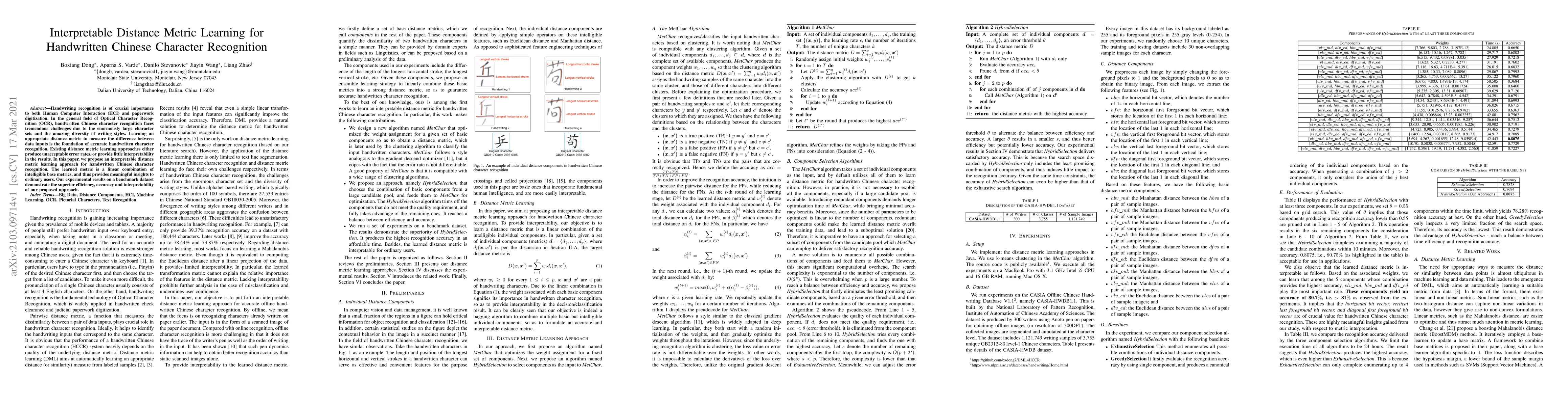 This paper proposes an interpretable distance metric learning method for recognizing handwritten Chinese characters, overcoming challenges posed by large character sets and diverse writing styles. The method, which outputs a linear combination of understandable base metrics, demonstrates improved efficiency, accuracy, and interpretability over existing approaches.