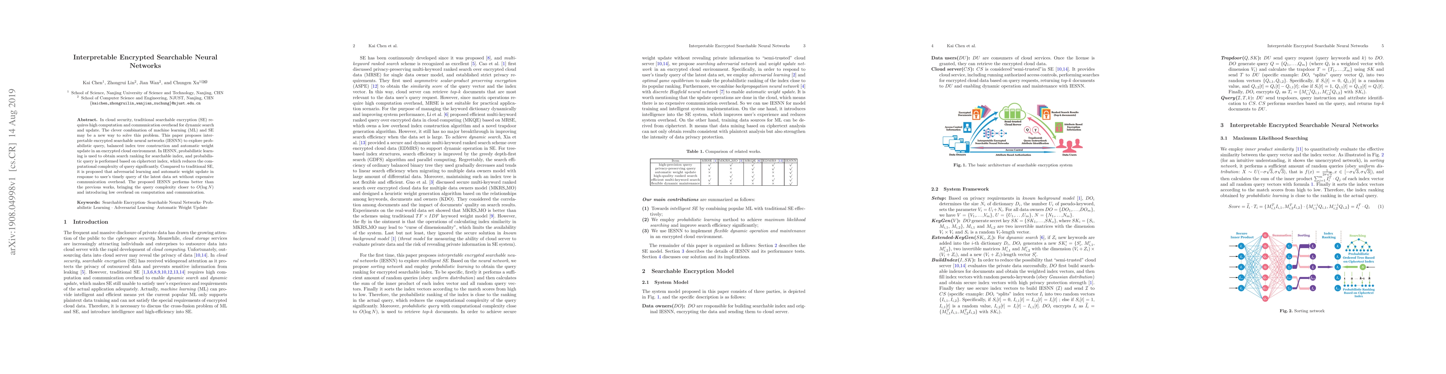 This paper introduces interpretable encrypted searchable neural networks (IESNN) to reduce computational and communication overhead in cloud security. It combines machine learning with searchable encryption, employing probabilistic query and automatic weight updates to achieve lower query complexity and minimal overhead.