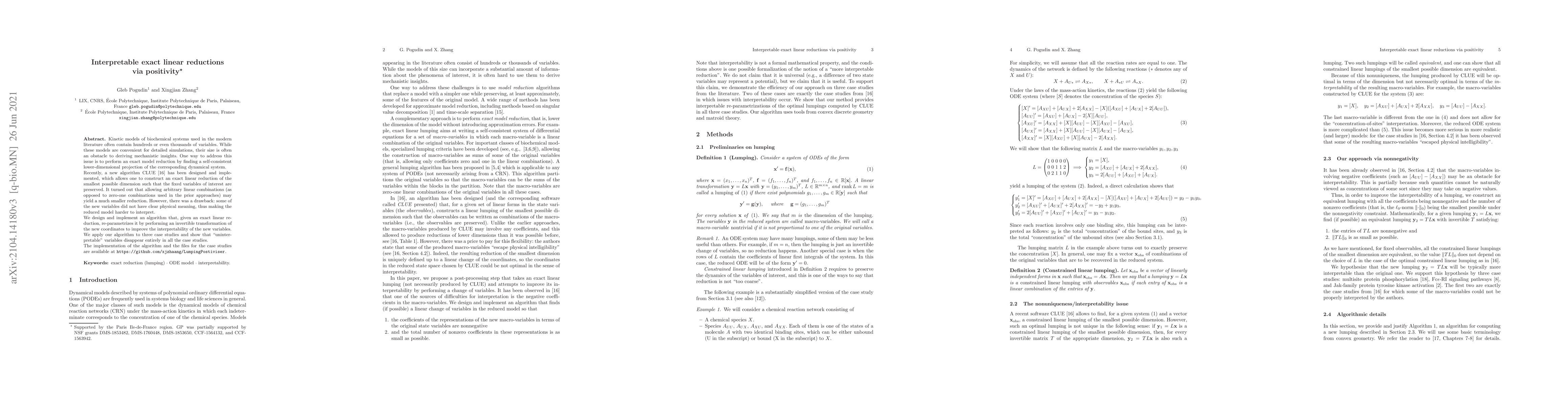Kinetic models of biochemical systems used in the modern literature often contain hundreds or even thousands of variables. While these models are convenient for detailed simulations, their size is often an obstacle to deriving mechanistic insights. One way to address this issue is to perform an exact model reduction by finding a self-consistent lower-dimensional projection of the corresponding dynamical system. Recently, a new algorithm CLUE has been designed and implemented, which allows one to construct an exact linear reduction of the smallest possible dimension such that the fixed variables of interest are preserved. It turned out that allowing arbitrary linear combinations (as opposed to zero-one combinations used in the prior approaches) may yield a much smaller reduction. However, there was a drawback: some of the new variables did not have clear physical meaning, thus making the reduced model harder to interpret. We design and implement an algorithm that, given an exact linear reduction, re-parametrizes it by performing an invertible transformation of the new coordinates to improve the interpretability of the new variables. We apply our algorithm to three case studies and show that "uninterpretable" variables disappear entirely in all the case studies. The implementation of the algorithm and the files for the case studies are available at https://github.com/xjzhaang/LumpingPostiviser.