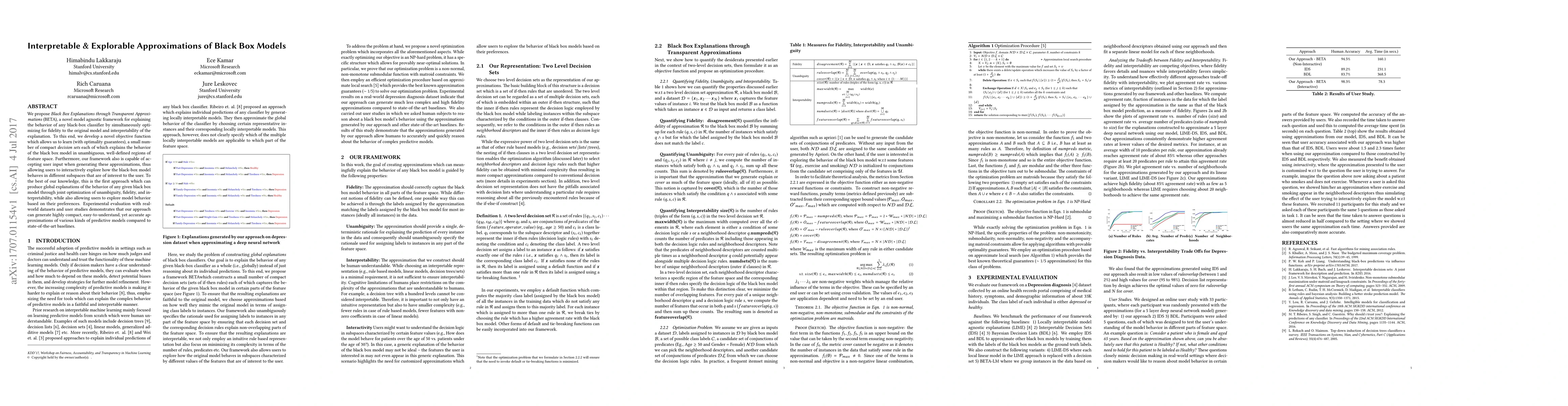 The paper introduces BETA, a framework for explaining black-box classifiers by creating transparent approximations that balance model fidelity and interpretability. It allows users to interactively explore model behavior, generating global explanations through joint optimization of clarity, accuracy, and user-specific preferences. Experimental results show that BETA produces accurate and understandable explanations compared to other methods.