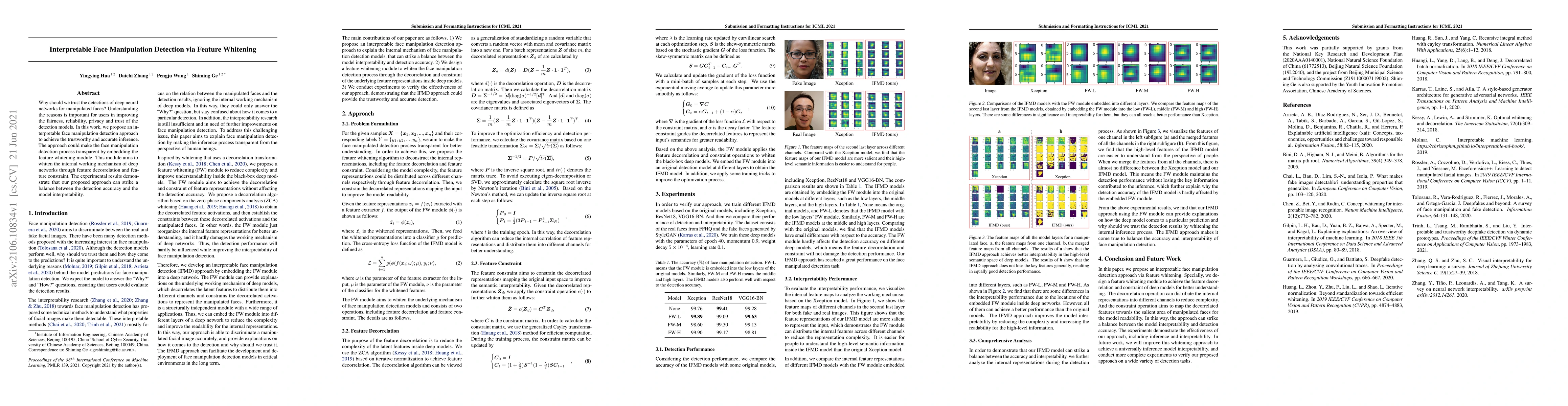 This paper proposes an interpretable face manipulation detection method using a feature whitening module to enhance transparency and trustworthiness. The approach balances detection accuracy with model interpretability by decorrelating and constraining features in deep neural networks.