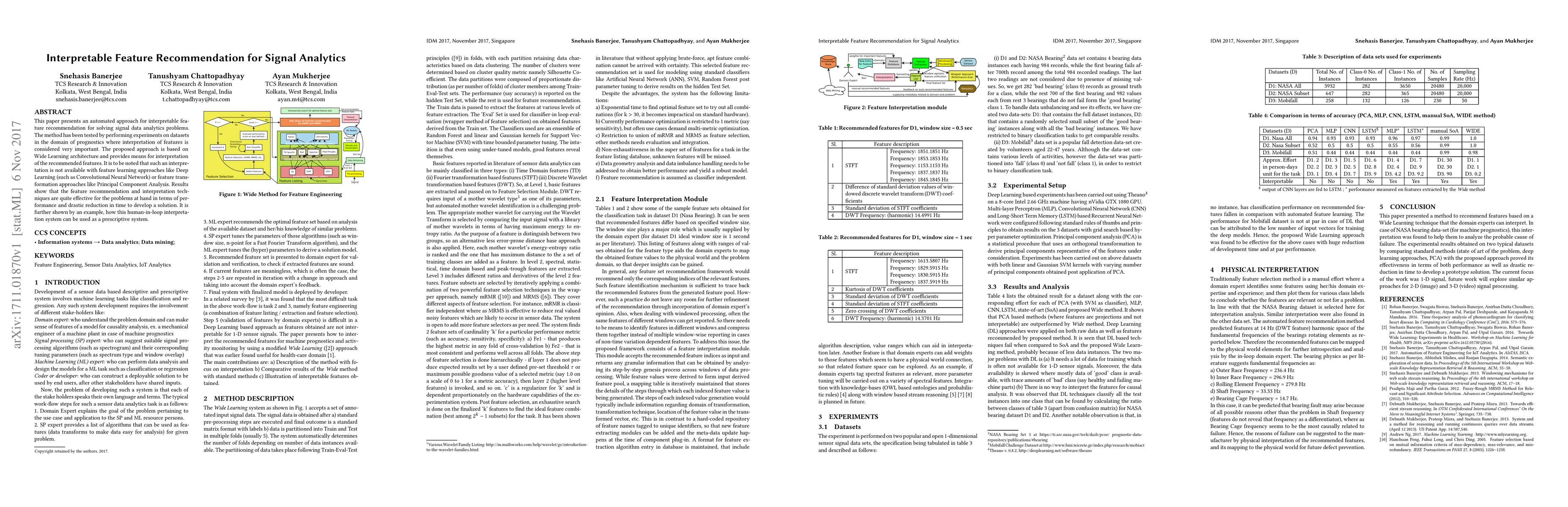 This paper presents an automated approach for interpretable feature recommendation for solving signal data analytics problems. The method has been tested by performing experiments on datasets in the domain of prognostics where interpretation of features is considered very important. The proposed approach is based on Wide Learning architecture and provides means for interpretation of the recommended features. It is to be noted that such an interpretation is not available with feature learning approaches like Deep Learning (such as Convolutional Neural Network) or feature transformation approaches like Principal Component Analysis. Results show that the feature recommendation and interpretation techniques are quite effective for the problems at hand in terms of performance and drastic reduction in time to develop a solution. It is further shown by an example, how this human-in-loop interpretation system can be used as a prescriptive system.