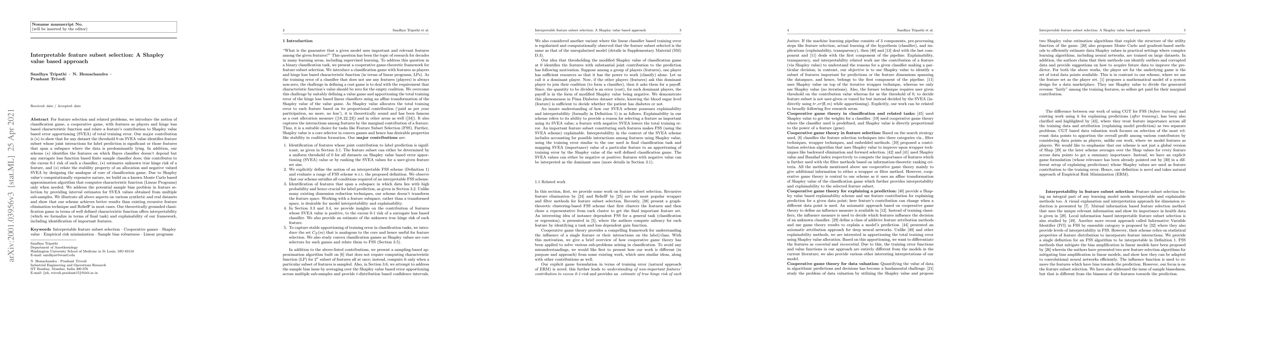 This paper introduces a Shapley value-based approach for interpretable feature subset selection, framing feature selection as a classification game. It identifies significant feature subsets and features that contribute to the excess risk of finite sample classifiers, while addressing computational challenges and sample bias through Monte Carlo approximations and interval estimates.