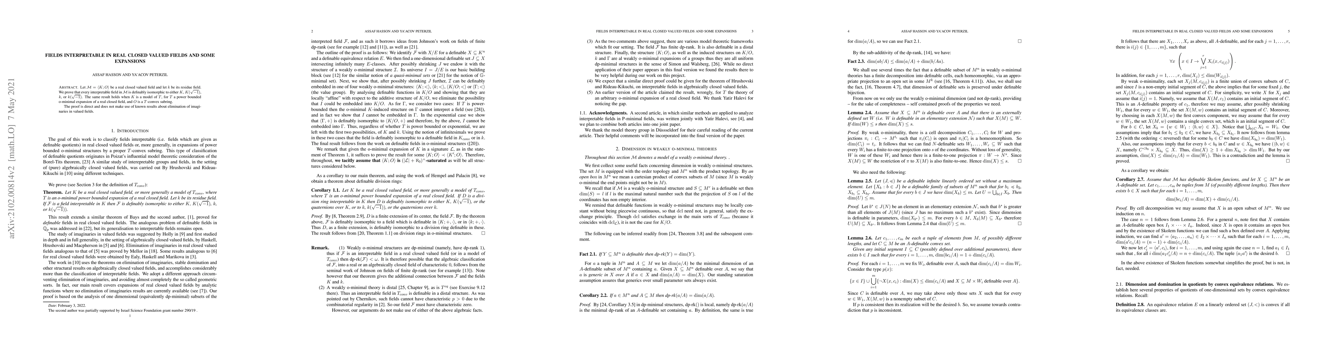 This paper proves that in real closed valued fields and their o-minimal power bounded expansions, every interpretable field is definably isomorphic to $K$, $K(\sqrt{-1})$, the residue field $k$, or $k(\sqrt{-1})$. The proof is direct and does not rely on prior results about elimination of imaginaries.