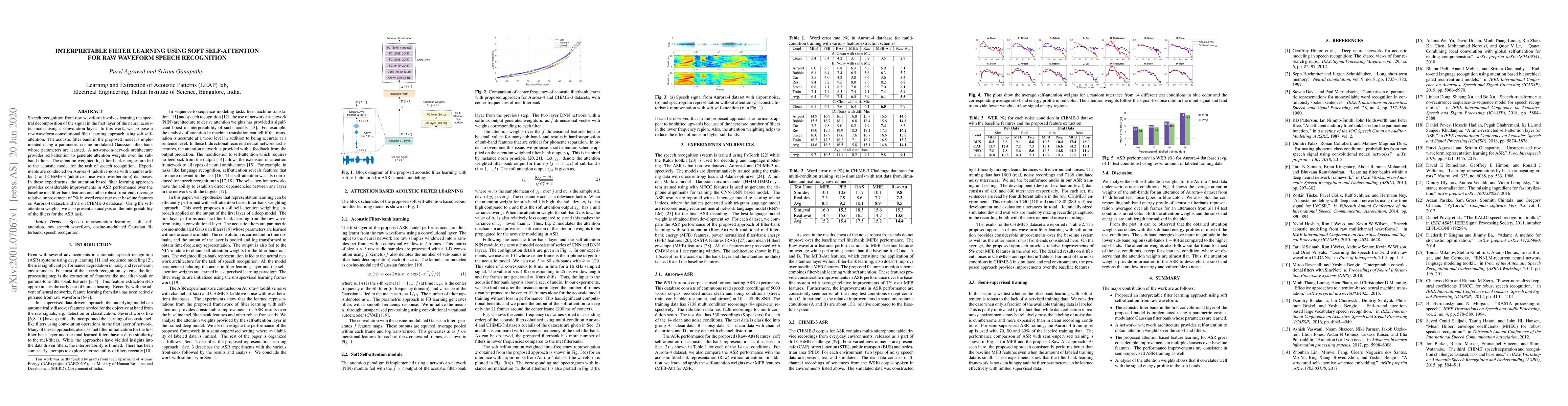 This paper proposes a novel raw waveform convolutional filter learning approach using soft self-attention for speech recognition, achieving significant improvements over baseline methods. The model employs a parametric cosine-modulated Gaussian filter bank with learned parameters, enhanced by self-attention to generate interpretable attention weights for better performance.