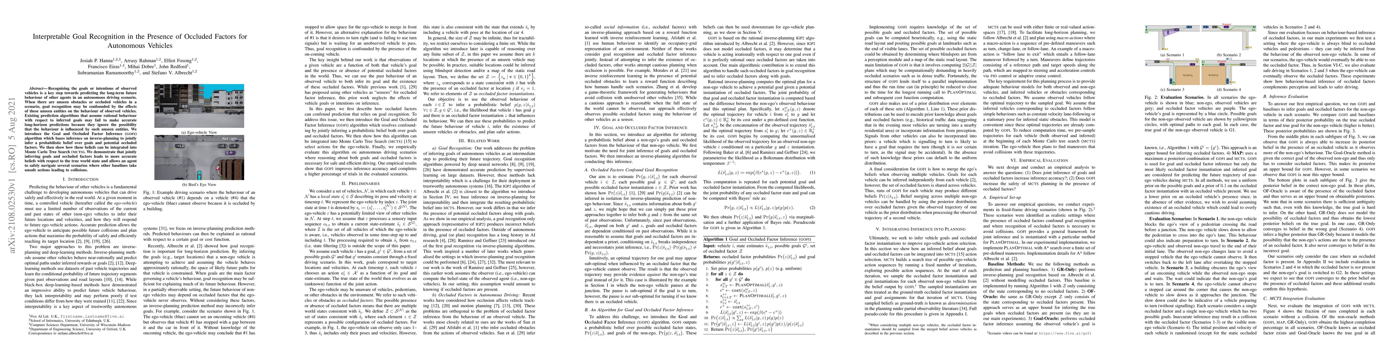 Recognising the goals or intentions of observed vehicles is a key step towards predicting the long-term future behaviour of other agents in an autonomous driving scenario. When there are unseen obstacles or occluded vehicles in a scenario, goal recognition may be confounded by the effects of these unseen entities on the behaviour of observed vehicles. Existing prediction algorithms that assume rational behaviour with respect to inferred goals may fail to make accurate long-horizon predictions because they ignore the possibility that the behaviour is influenced by such unseen entities. We introduce the Goal and Occluded Factor Inference (GOFI) algorithm which bases inference on inverse-planning to jointly infer a probabilistic belief over goals and potential occluded factors. We then show how these beliefs can be integrated into Monte Carlo Tree Search (MCTS). We demonstrate that jointly inferring goals and occluded factors leads to more accurate beliefs with respect to the true world state and allows an agent to safely navigate several scenarios where other baselines take unsafe actions leading to collisions.
