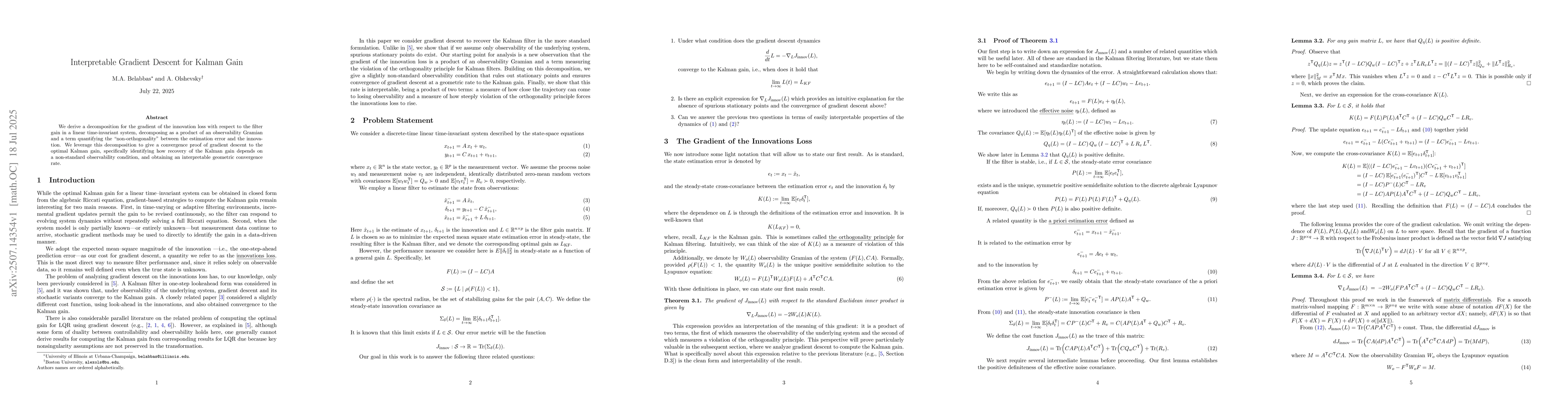We derive a decomposition for the gradient of the innovation loss with respect to the filter gain in a linear time-invariant system, decomposing as a product of an observability Gramian and a term quantifying the ``non-orthogonality" between the estimation error and the innovation. We leverage this decomposition to give a convergence proof of gradient descent to the optimal Kalman gain, specifically identifying how recovery of the Kalman gain depends on a non-standard observability condition, and obtaining an interpretable geometric convergence rate.
