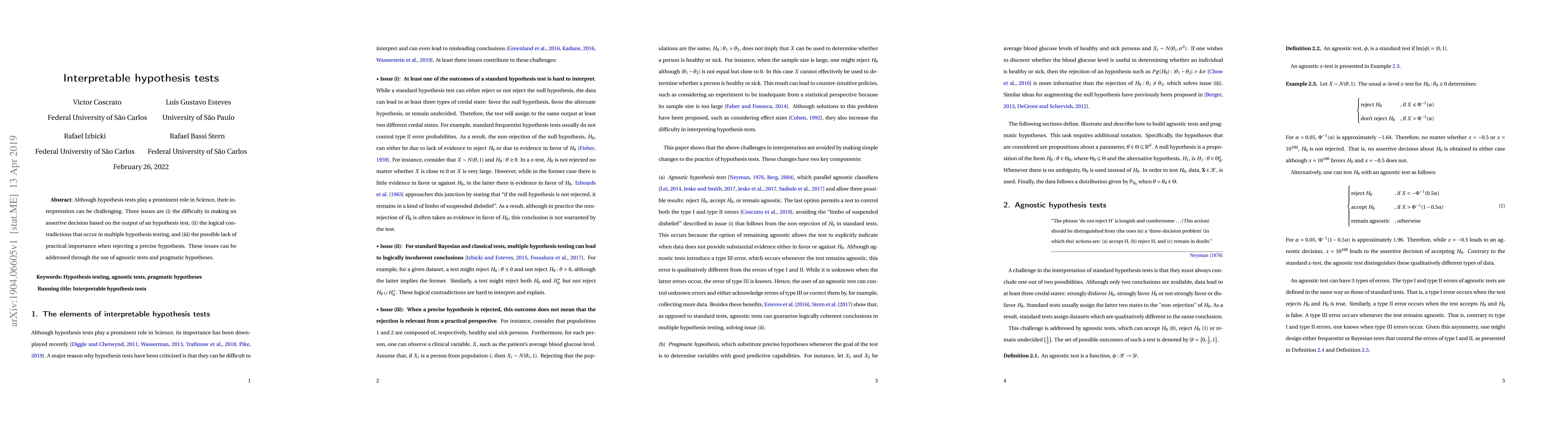 Although hypothesis tests play a prominent role in Science, their interpretation can be challenging. Three issues are (i) the difficulty in making an assertive decision based on the output of an hypothesis test, (ii) the logical contradictions that occur in multiple hypothesis testing, and (iii) the possible lack of practical importance when rejecting a precise hypothesis. These issues can be addressed through the use of agnostic tests and pragmatic hypotheses.