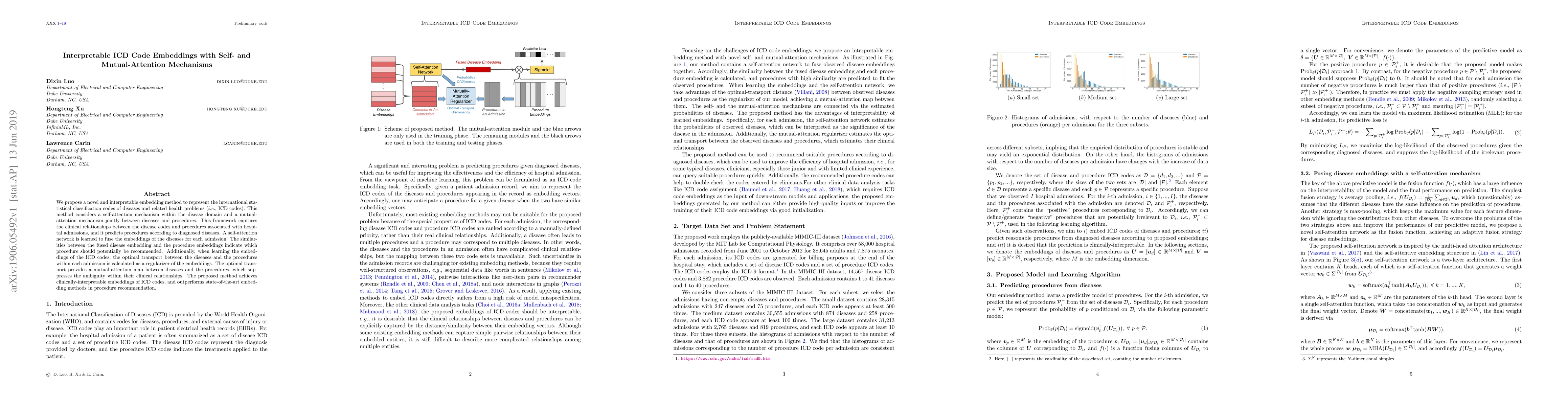 We propose a novel and interpretable embedding method to represent the international statistical classification codes of diseases and related health problems (i.e., ICD codes). This method considers a self-attention mechanism within the disease domain and a mutual-attention mechanism jointly between diseases and procedures. This framework captures the clinical relationships between the disease codes and procedures associated with hospital admissions, and it predicts procedures according to diagnosed diseases. A self-attention network is learned to fuse the embeddings of the diseases for each admission. The similarities between the fused disease embedding and the procedure embeddings indicate which procedure should potentially be recommended. Additionally, when learning the embeddings of the ICD codes, the optimal transport between the diseases and the procedures within each admission is calculated as a regularizer of the embeddings. The optimal transport provides a mutual-attention map between diseases and the procedures, which suppresses the ambiguity within their clinical relationships. The proposed method achieves clinically-interpretable embeddings of ICD codes, and outperforms state-of-the-art embedding methods in procedure recommendation.