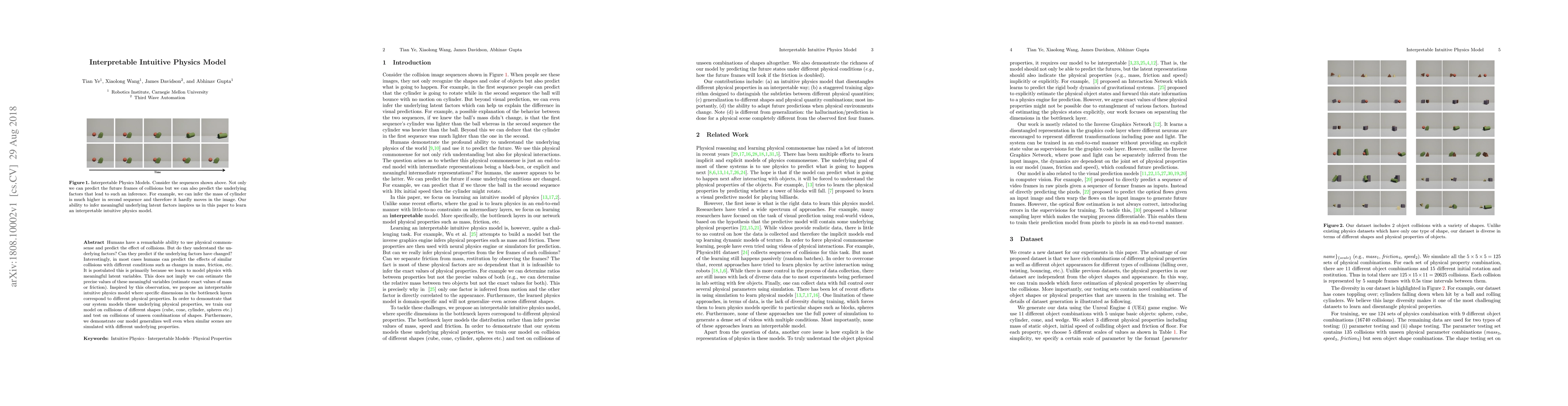 Humans have a remarkable ability to use physical commonsense and predict the effect of collisions. But do they understand the underlying factors? Can they predict if the underlying factors have changed? Interestingly, in most cases humans can predict the effects of similar collisions with different conditions such as changes in mass, friction, etc. It is postulated this is primarily because we learn to model physics with meaningful latent variables. This does not imply we can estimate the precise values of these meaningful variables (estimate exact values of mass or friction). Inspired by this observation, we propose an interpretable intuitive physics model where specific dimensions in the bottleneck layers correspond to different physical properties. In order to demonstrate that our system models these underlying physical properties, we train our model on collisions of different shapes (cube, cone, cylinder, spheres etc.) and test on collisions of unseen combinations of shapes. Furthermore, we demonstrate our model generalizes well even when similar scenes are simulated with different underlying properties.