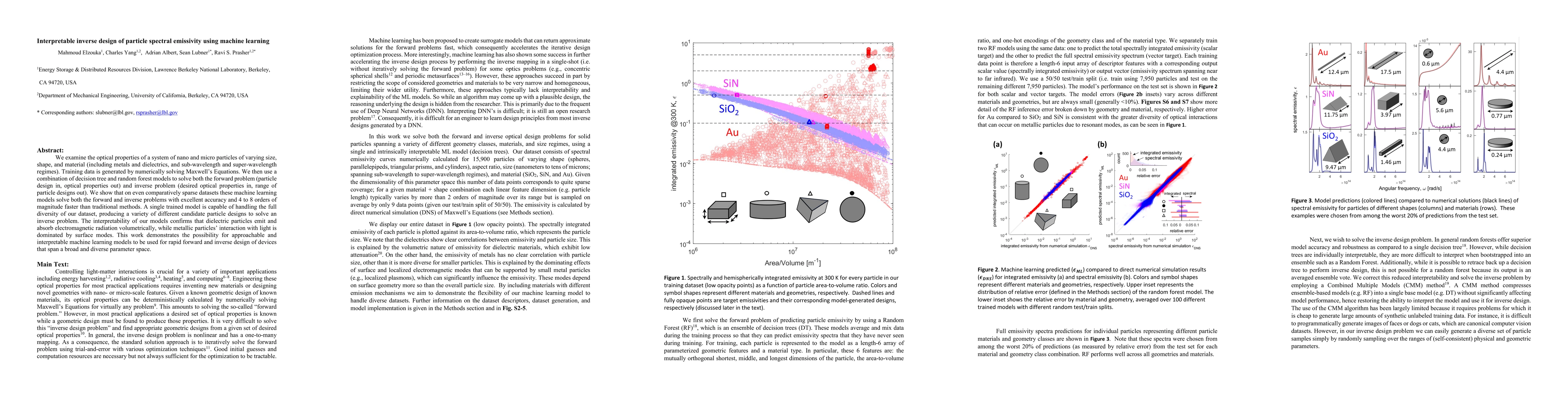 This paper explores the use of machine learning models, specifically decision trees and random forests, to rapidly design particles with desired optical properties by solving both forward and inverse problems. The models achieve high accuracy and significantly outperform traditional methods, demonstrating interpretability that clarifies the optical behavior of different particle materials.