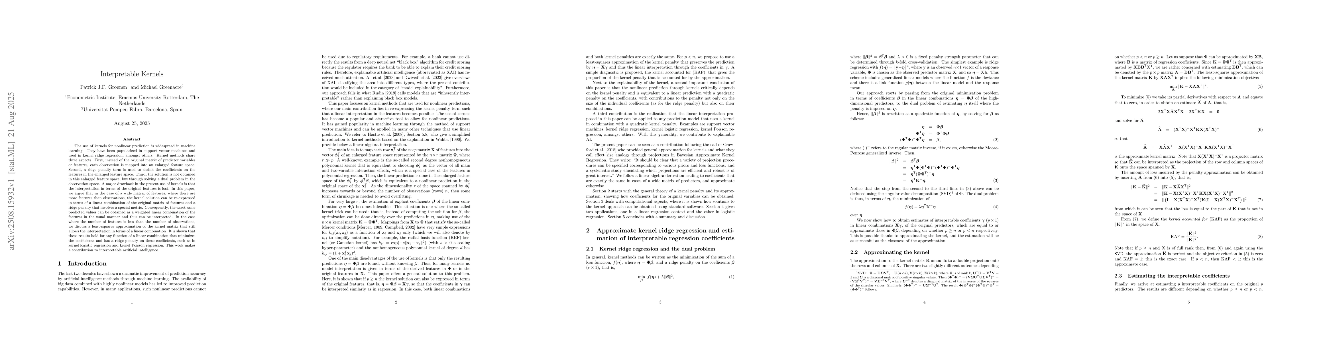 The use of kernels for nonlinear prediction is widespread in machine learning. They have been popularized in support vector machines and used in kernel ridge regression, amongst others. Kernel methods share three aspects. First, instead of the original matrix of predictor variables or features, each observation is mapped into an enlarged feature space. Second, a ridge penalty term is used to shrink the coefficients on the features in the enlarged feature space. Third, the solution is not obtained in this enlarged feature space, but through solving a dual problem in the observation space. A major drawback in the present use of kernels is that the interpretation in terms of the original features is lost. In this paper, we argue that in the case of a wide matrix of features, where there are more features than observations, the kernel solution can be re-expressed in terms of a linear combination of the original matrix of features and a ridge penalty that involves a special metric. Consequently, the exact same predicted values can be obtained as a weighted linear combination of the features in the usual manner and thus can be interpreted. In the case where the number of features is less than the number of observations, we discuss a least-squares approximation of the kernel matrix that still allows the interpretation in terms of a linear combination. It is shown that these results hold for any function of a linear combination that minimizes the coefficients and has a ridge penalty on these coefficients, such as in kernel logistic regression and kernel Poisson regression. This work makes a contribution to interpretable artificial intelligence.