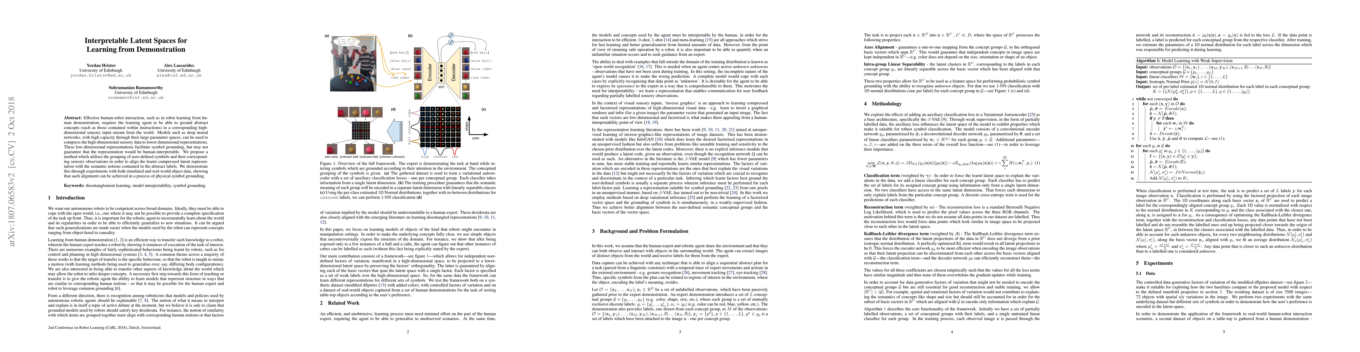 This paper proposes a method to create human-interpretable latent spaces for learning from demonstration, enabling robots to understand abstract concepts through physical symbol grounding. The approach aligns compressed latent representations with semantic notions using user-defined symbols and sensory observations.
