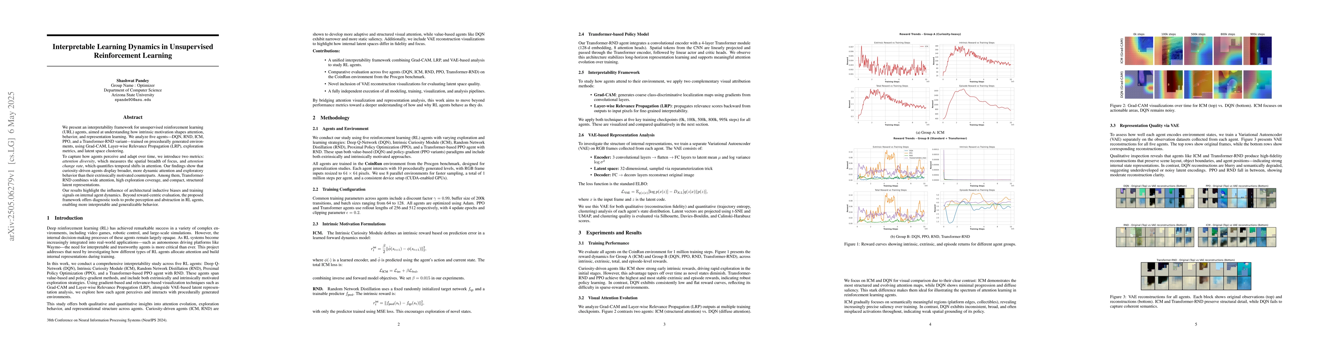 The research employs an interpretability framework for unsupervised reinforcement learning (URL) agents, analyzing DQN, RND, ICM, PPO, and a Transformer-RND variant using Grad-CAM, LRP, exploration metrics, and latent space clustering. Two new metrics, attention diversity and attention change rate, are introduced to capture agents' perception and adaptation over time.