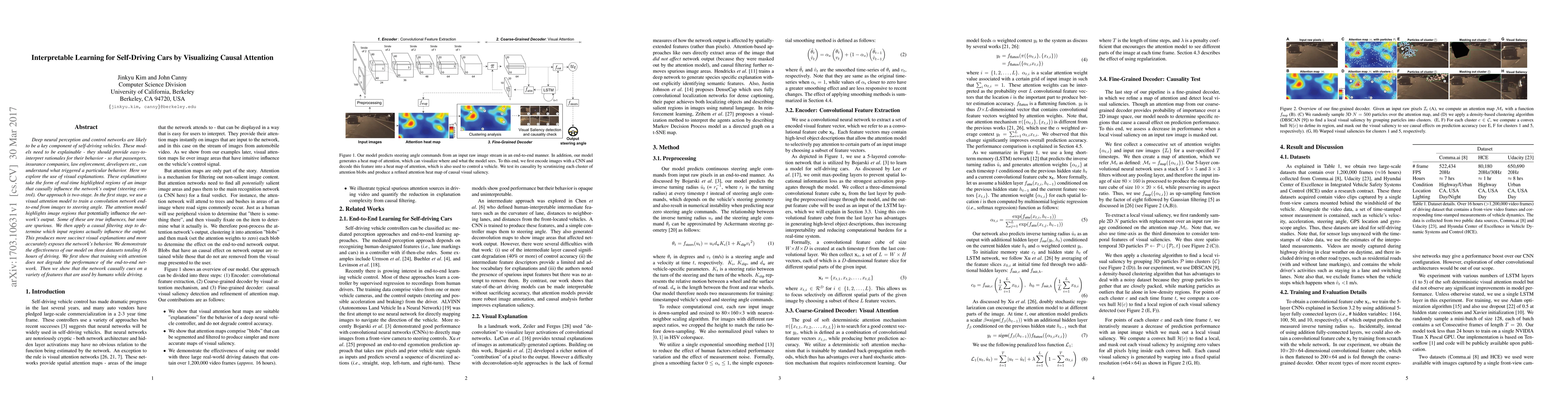 This paper proposes an interpretable learning method for self-driving cars by visualizing causal attention, highlighting image regions that genuinely influence the network's steering decisions. The approach combines a visual attention model with causal filtering to provide succinct and accurate explanations without degrading network performance.