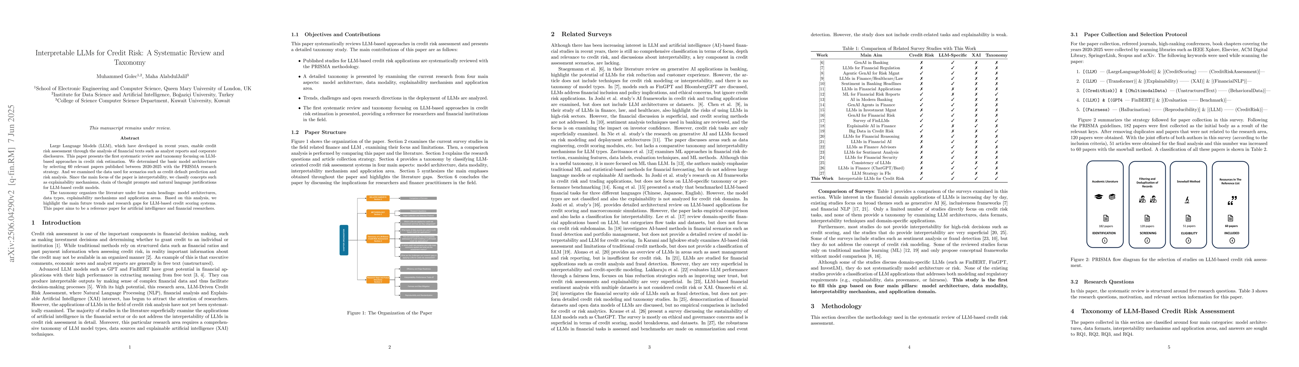 Develops a taxonomy organizing literature on LLM-based credit risk estimation under model architectures, data types, explainability mechanisms, and application areas.
