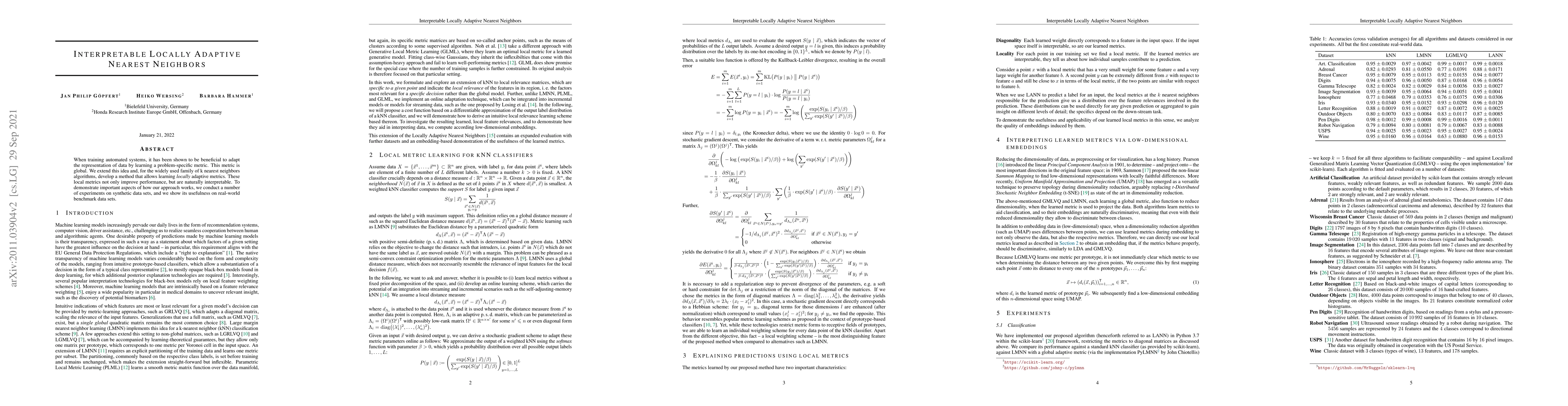 This paper proposes a method for k nearest neighbors algorithms that learns locally adaptive metrics, improving performance and interpretability. Experiments on synthetic and real-world datasets demonstrate the effectiveness of the approach.