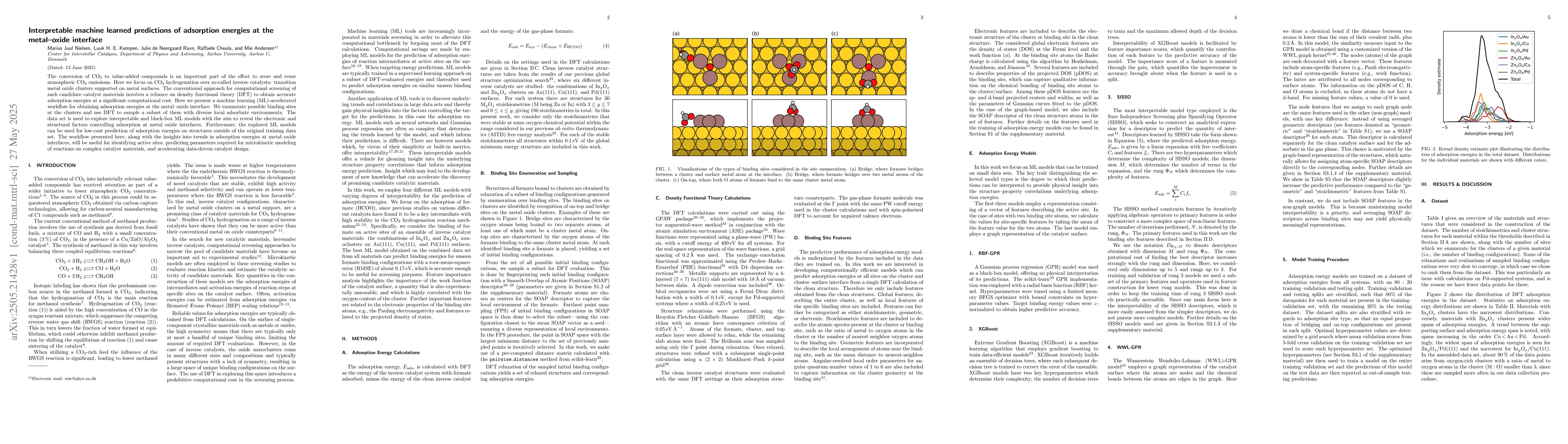 This work stands out by providing an interpretable ML approach to understand and predict adsorption energies at complex metal--oxide interfaces, offering a low-cost alternative to traditional DFT methods.