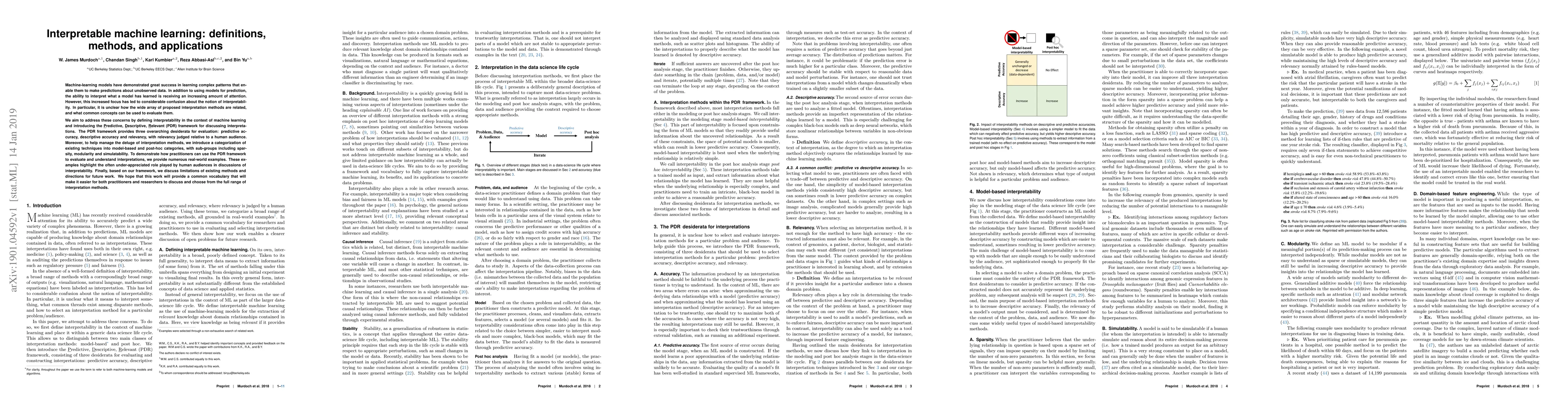 Machine-learning models have demonstrated great success in learning complex patterns that enable them to make predictions about unobserved data. In addition to using models for prediction, the ability to interpret what a model has learned is receiving an increasing amount of attention. However, this increased focus has led to considerable confusion about the notion of interpretability. In particular, it is unclear how the wide array of proposed interpretation methods are related, and what common concepts can be used to evaluate them. We aim to address these concerns by defining interpretability in the context of machine learning and introducing the Predictive, Descriptive, Relevant (PDR) framework for discussing interpretations. The PDR framework provides three overarching desiderata for evaluation: predictive accuracy, descriptive accuracy and relevancy, with relevancy judged relative to a human audience. Moreover, to help manage the deluge of interpretation methods, we introduce a categorization of existing techniques into model-based and post-hoc categories, with sub-groups including sparsity, modularity and simulatability. To demonstrate how practitioners can use the PDR framework to evaluate and understand interpretations, we provide numerous real-world examples. These examples highlight the often under-appreciated role played by human audiences in discussions of interpretability. Finally, based on our framework, we discuss limitations of existing methods and directions for future work. We hope that this work will provide a common vocabulary that will make it easier for both practitioners and researchers to discuss and choose from the full range of interpretation methods.
