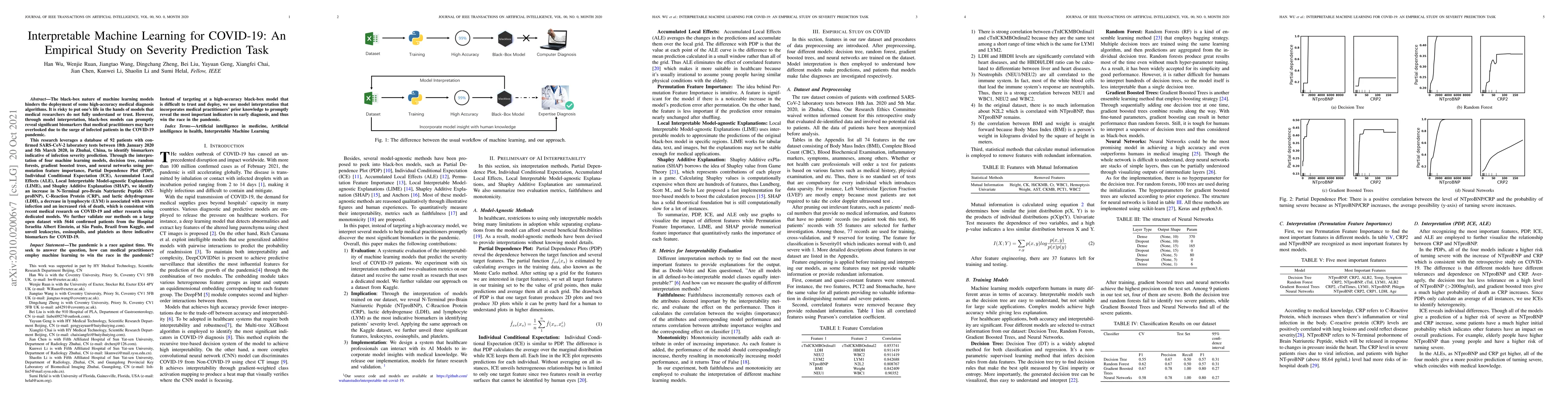 The black-box nature of machine learning models hinders the deployment of some high-accuracy models in medical diagnosis. It is risky to put one's life in the hands of models that medical researchers do not fully understand. However, through model interpretation, black-box models can promptly reveal significant biomarkers that medical practitioners may have overlooked due to the surge of infected patients in the COVID-19 pandemic. This research leverages a database of 92 patients with confirmed SARS-CoV-2 laboratory tests between 18th Jan. 2020 and 5th Mar. 2020, in Zhuhai, China, to identify biomarkers indicative of severity prediction. Through the interpretation of four machine learning models, decision tree, random forests, gradient boosted trees, and neural networks using permutation feature importance, Partial Dependence Plot (PDP), Individual Conditional Expectation (ICE), Accumulated Local Effects (ALE), Local Interpretable Model-agnostic Explanations (LIME), and Shapley Additive Explanation (SHAP), we identify an increase in N-Terminal pro-Brain Natriuretic Peptide (NTproBNP), C-Reaction Protein (CRP), and lactic dehydrogenase (LDH), a decrease in lymphocyte (LYM) is associated with severe infection and an increased risk of death, which is consistent with recent medical research on COVID-19 and other research using dedicated models. We further validate our methods on a large open dataset with 5644 confirmed patients from the Hospital Israelita Albert Einstein, at S\~ao Paulo, Brazil from Kaggle, and unveil leukocytes, eosinophils, and platelets as three indicative biomarkers for COVID-19.