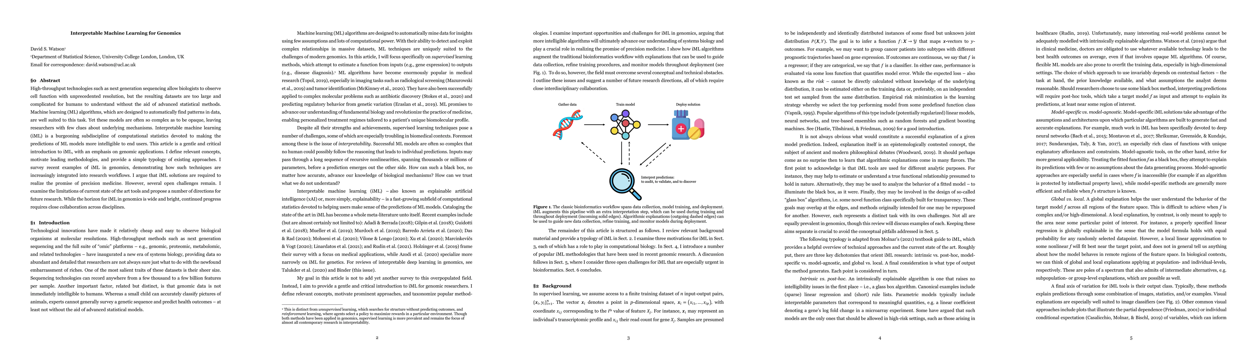 This paper introduces interpretable machine learning (iML) as a means to make complex genomic data more understandable, highlighting its importance for precision medicine. It surveys current methodologies and challenges, proposing future research directions to enhance collaboration across disciplines.
