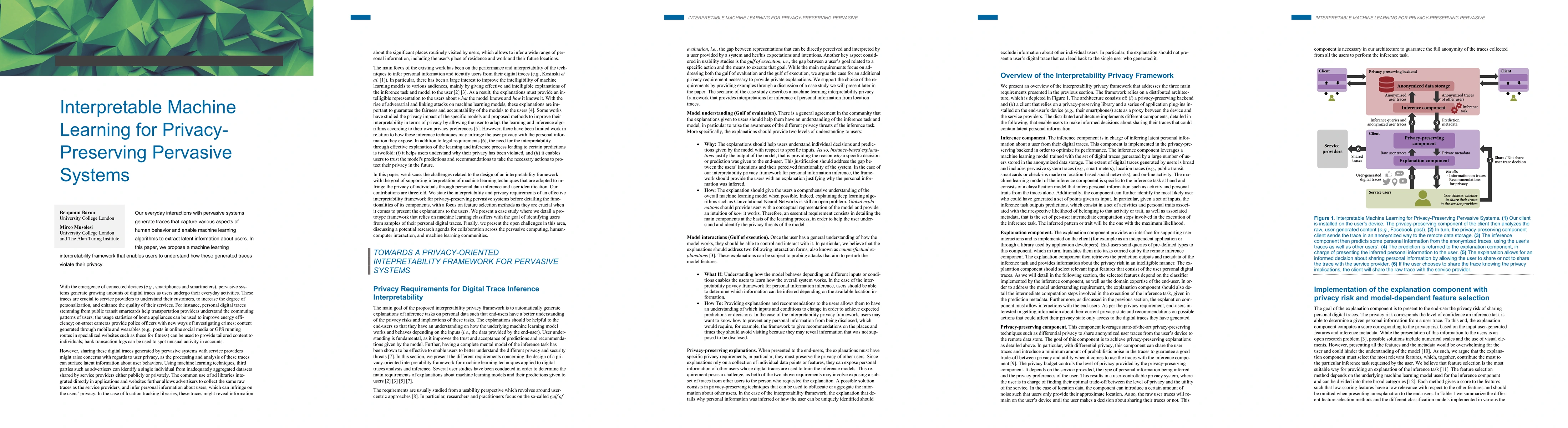 This paper proposes an interpretability framework for machine learning in pervasive systems, enabling users to understand how generated traces violate their privacy. It aims to provide a more transparent approach to machine learning in applications where user data is sensitive or valuable.