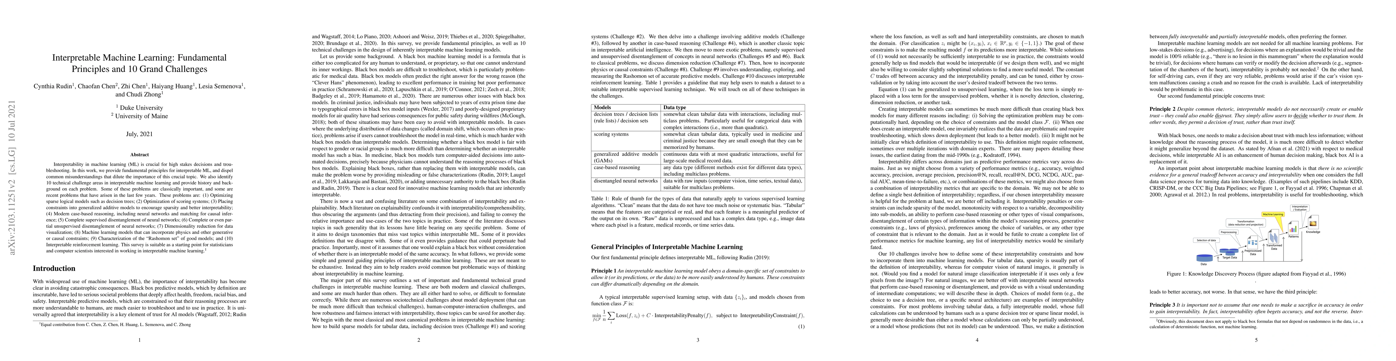 This paper outlines fundamental principles of interpretable machine learning, addressing misconceptions and highlighting ten significant technical challenges, including sparse logical models, optimization of scoring systems, and interpretable reinforcement learning, to guide statisticians and computer scientists in the field.