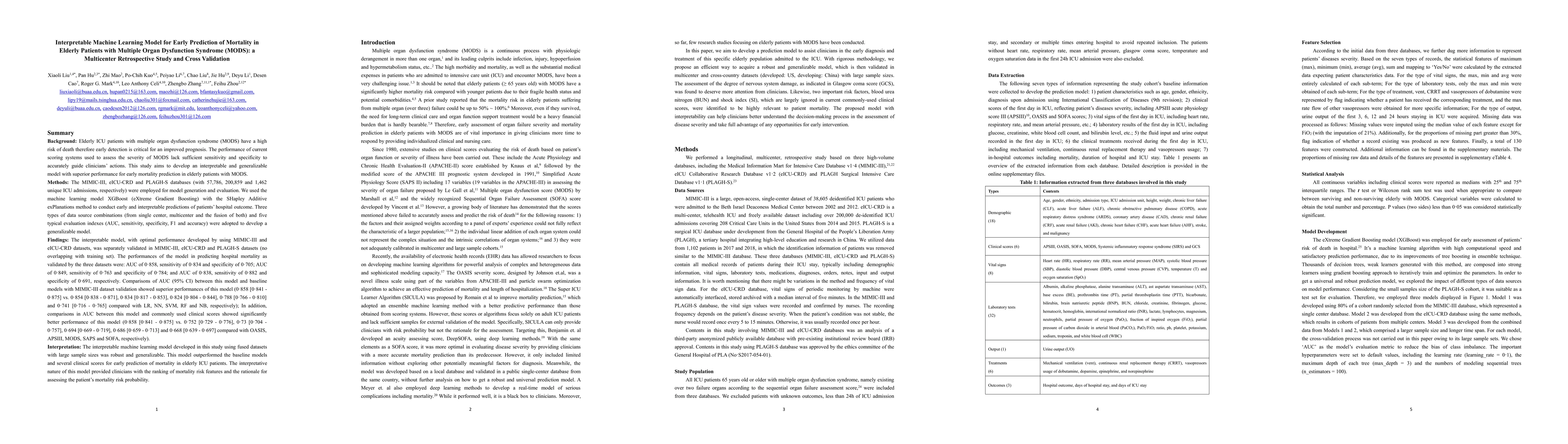 This study developed an interpretable eXtreme Gradient Boosting model for early mortality prediction in elderly patients with Multiple Organ Dysfunction Syndrome, achieving superior performance compared to baseline models and clinical scores. The model's robustness and generalizability were validated across multiple datasets, providing clinicians with clear risk feature rankings.