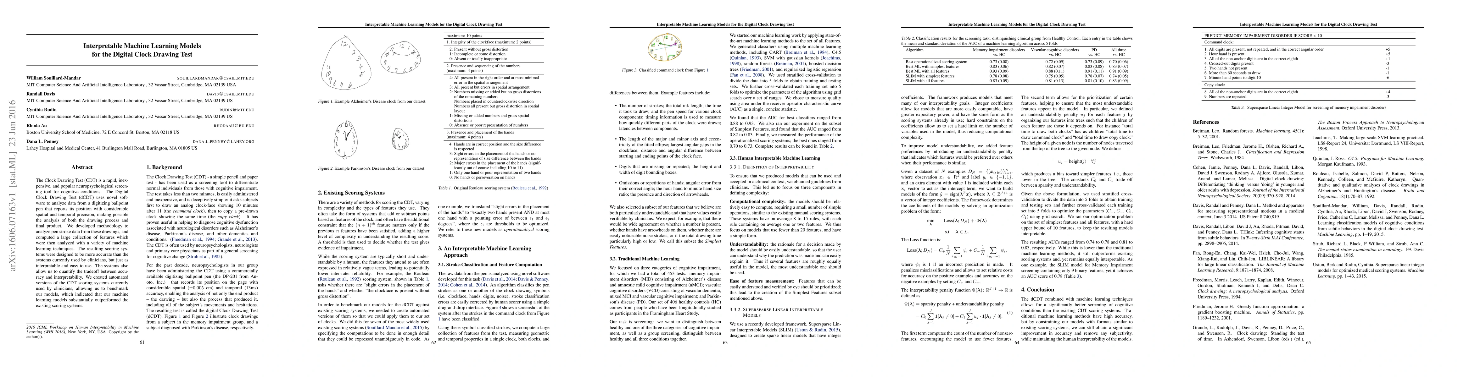 The Clock Drawing Test (CDT) is a rapid, inexpensive, and popular neuropsychological screening tool for cognitive conditions. The Digital Clock Drawing Test (dCDT) uses novel software to analyze data from a digitizing ballpoint pen that reports its position with considerable spatial and temporal precision, making possible the analysis of both the drawing process and final product. We developed methodology to analyze pen stroke data from these drawings, and computed a large collection of features which were then analyzed with a variety of machine learning techniques. The resulting scoring systems were designed to be more accurate than the systems currently used by clinicians, but just as interpretable and easy to use. The systems also allow us to quantify the tradeoff between accuracy and interpretability. We created automated versions of the CDT scoring systems currently used by clinicians, allowing us to benchmark our models, which indicated that our machine learning models substantially outperformed the existing scoring systems.