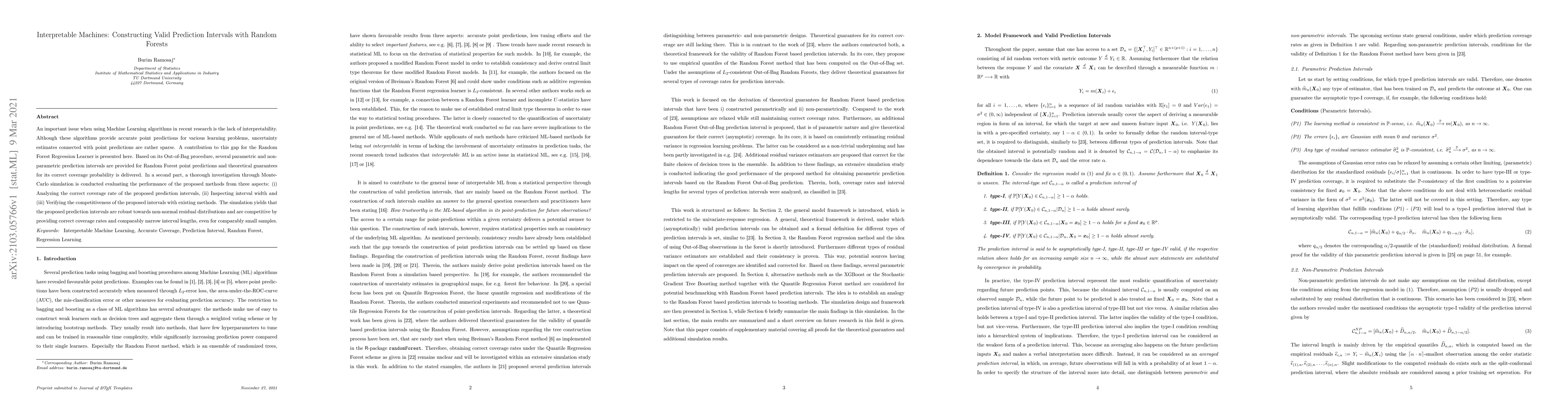 This paper proposes several prediction intervals for Random Forest Regression, addressing the lack of interpretability in machine learning. The study evaluates the performance of these intervals through Monte-Carlo simulations, showing robust coverage and competitive interval widths compared to existing methods.