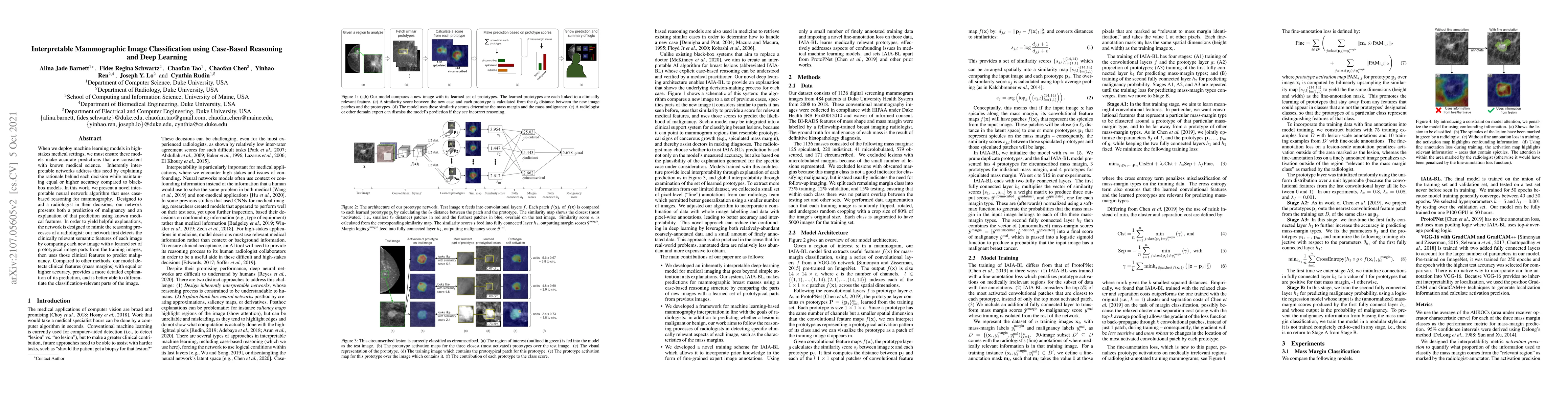 This paper introduces an interpretable neural network combining case-based reasoning and deep learning to classify mammographic images, aiming to provide accurate malignancy predictions alongside detailed explanations that align with radiologists' reasoning processes. The model achieves comparable or superior detection of clinical features and offers more insightful decision rationales compared to traditional black-box models.