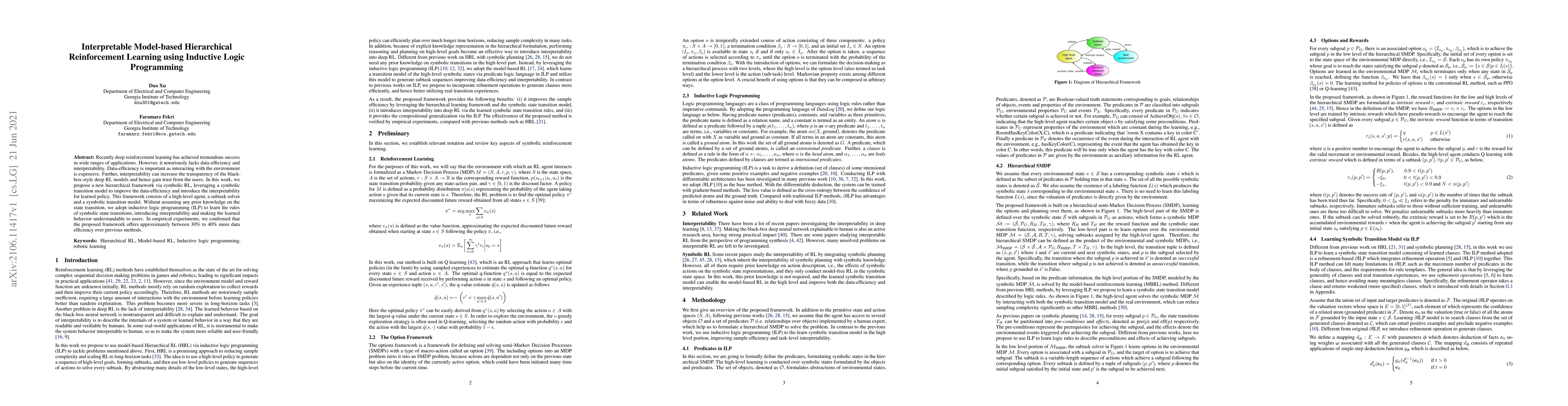 This paper proposes a hierarchical reinforcement learning framework using inductive logic programming to enhance data-efficiency and interpretability of learned policies. The framework, incorporating a high-level agent, subtask solver, and symbolic transition model, shows improved data efficiency by 30-40% over existing methods.