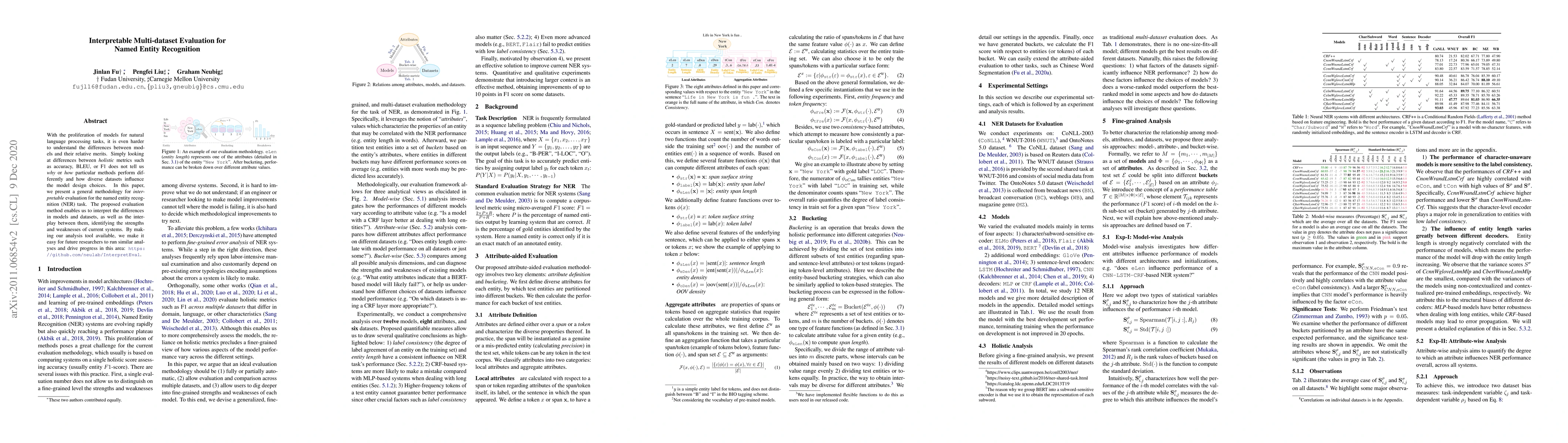 With the proliferation of models for natural language processing tasks, it is even harder to understand the differences between models and their relative merits. Simply looking at differences between holistic metrics such as accuracy, BLEU, or F1 does not tell us why or how particular methods perform differently and how diverse datasets influence the model design choices. In this paper, we present a general methodology for interpretable evaluation for the named entity recognition (NER) task. The proposed evaluation method enables us to interpret the differences in models and datasets, as well as the interplay between them, identifying the strengths and weaknesses of current systems. By making our analysis tool available, we make it easy for future researchers to run similar analyses and drive progress in this area: https://github.com/neulab/InterpretEval.