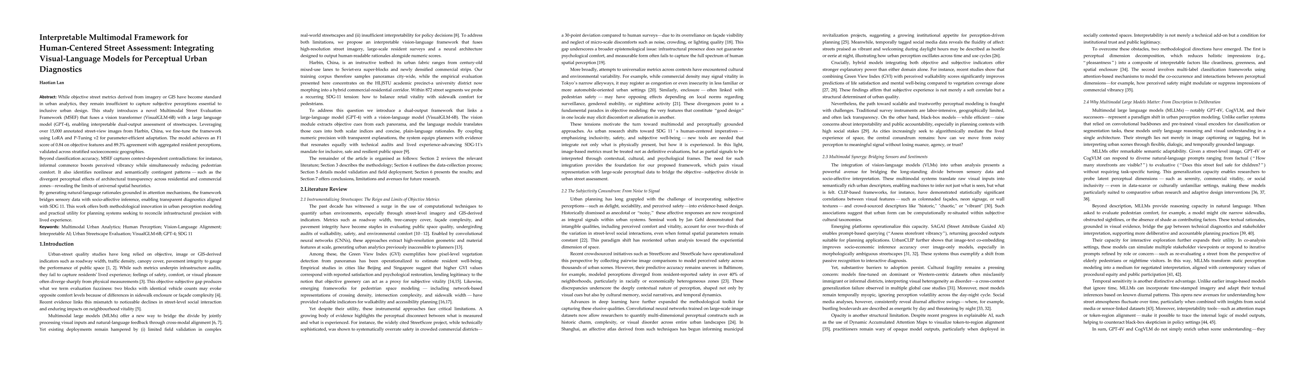 While objective street metrics derived from imagery or GIS have become standard in urban analytics, they remain insufficient to capture subjective perceptions essential to inclusive urban design. This study introduces a novel Multimodal Street Evaluation Framework (MSEF) that fuses a vision transformer (VisualGLM-6B) with a large language model (GPT-4), enabling interpretable dual-output assessment of streetscapes. Leveraging over 15,000 annotated street-view images from Harbin, China, we fine-tune the framework using LoRA and P-Tuning v2 for parameter-efficient adaptation. The model achieves an F1 score of 0.84 on objective features and 89.3 percent agreement with aggregated resident perceptions, validated across stratified socioeconomic geographies. Beyond classification accuracy, MSEF captures context-dependent contradictions: for instance, informal commerce boosts perceived vibrancy while simultaneously reducing pedestrian comfort. It also identifies nonlinear and semantically contingent patterns -- such as the divergent perceptual effects of architectural transparency across residential and commercial zones -- revealing the limits of universal spatial heuristics. By generating natural-language rationales grounded in attention mechanisms, the framework bridges sensory data with socio-affective inference, enabling transparent diagnostics aligned with SDG 11. This work offers both methodological innovation in urban perception modeling and practical utility for planning systems seeking to reconcile infrastructural precision with lived experience.