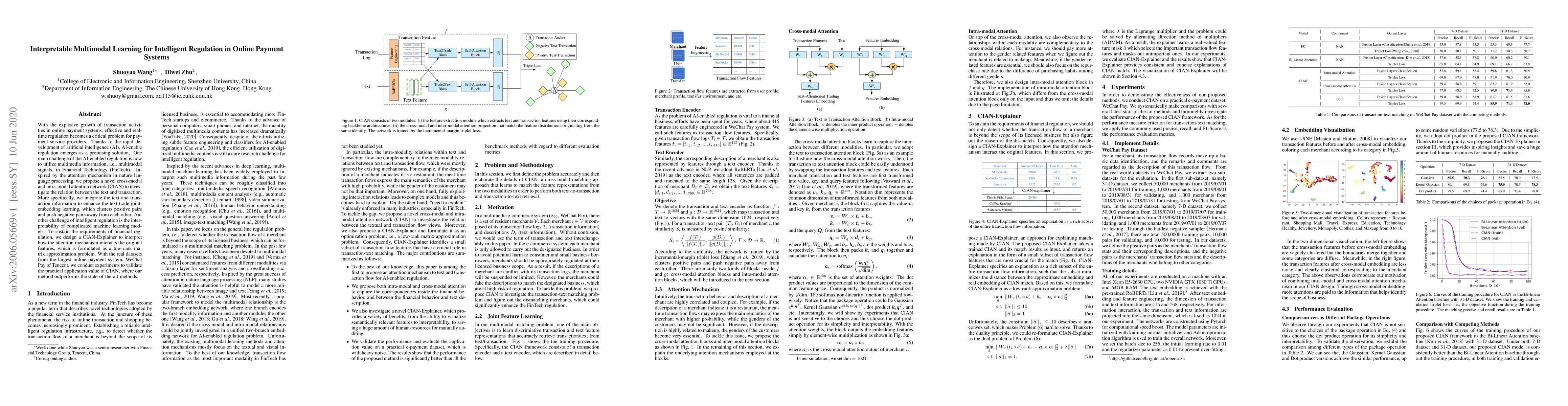With the explosive growth of transaction activities in online payment systems, effective and realtime regulation becomes a critical problem for payment service providers. Thanks to the rapid development of artificial intelligence (AI), AI-enable regulation emerges as a promising solution. One main challenge of the AI-enabled regulation is how to utilize multimedia information, i.e., multimodal signals, in Financial Technology (FinTech). Inspired by the attention mechanism in nature language processing, we propose a novel cross-modal and intra-modal attention network (CIAN) to investigate the relation between the text and transaction. More specifically, we integrate the text and transaction information to enhance the text-trade jointembedding learning, which clusters positive pairs and push negative pairs away from each other. Another challenge of intelligent regulation is the interpretability of complicated machine learning models. To sustain the requirements of financial regulation, we design a CIAN-Explainer to interpret how the attention mechanism interacts the original features, which is formulated as a low-rank matrix approximation problem. With the real datasets from the largest online payment system, WeChat Pay of Tencent, we conduct experiments to validate the practical application value of CIAN, where our method outperforms the state-of-the-art methods.