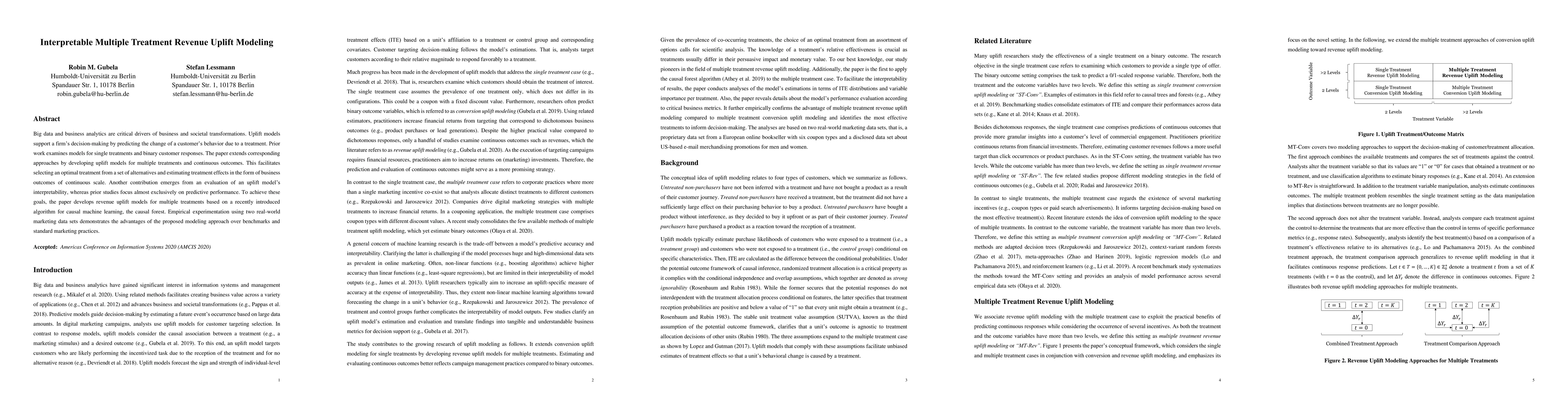Big data and business analytics are critical drivers of business and societal transformations. Uplift models support a firm's decision-making by predicting the change of a customer's behavior due to a treatment. Prior work examines models for single treatments and binary customer responses. The paper extends corresponding approaches by developing uplift models for multiple treatments and continuous outcomes. This facilitates selecting an optimal treatment from a set of alternatives and estimating treatment effects in the form of business outcomes of continuous scale. Another contribution emerges from an evaluation of an uplift model's interpretability, whereas prior studies focus almost exclusively on predictive performance. To achieve these goals, the paper develops revenue uplift models for multiple treatments based on a recently introduced algorithm for causal machine learning, the causal forest. Empirical experimentation using two real-world marketing data sets demonstrates the advantages of the proposed modeling approach over benchmarks and standard marketing practices.