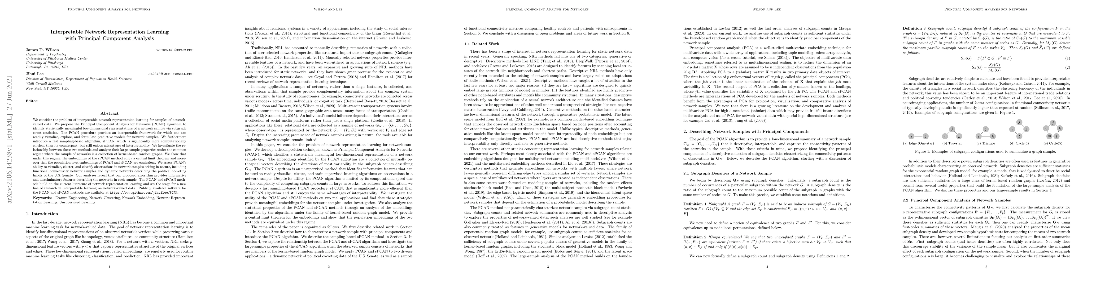 We consider the problem of interpretable network representation learning for samples of network-valued data. We propose the Principal Component Analysis for Networks (PCAN) algorithm to identify statistically meaningful low-dimensional representations of a network sample via subgraph count statistics. The PCAN procedure provides an interpretable framework for which one can readily visualize, explore, and formulate predictive models for network samples. We furthermore introduce a fast sampling-based algorithm, sPCAN, which is significantly more computationally efficient than its counterpart, but still enjoys advantages of interpretability. We investigate the relationship between these two methods and analyze their large-sample properties under the common regime where the sample of networks is a collection of kernel-based random graphs. We show that under this regime, the embeddings of the sPCAN method enjoy a central limit theorem and moreover that the population level embeddings of PCAN and sPCAN are equivalent. We assess PCAN's ability to visualize, cluster, and classify observations in network samples arising in nature, including functional connectivity network samples and dynamic networks describing the political co-voting habits of the U.S. Senate. Our analyses reveal that our proposed algorithm provides informative and discriminatory features describing the networks in each sample. The PCAN and sPCAN methods build on the current literature of network representation learning and set the stage for a new line of research in interpretable learning on network-valued data. Publicly available software for the PCAN and sPCAN methods are available at https://www.github.com/jihuilee/.