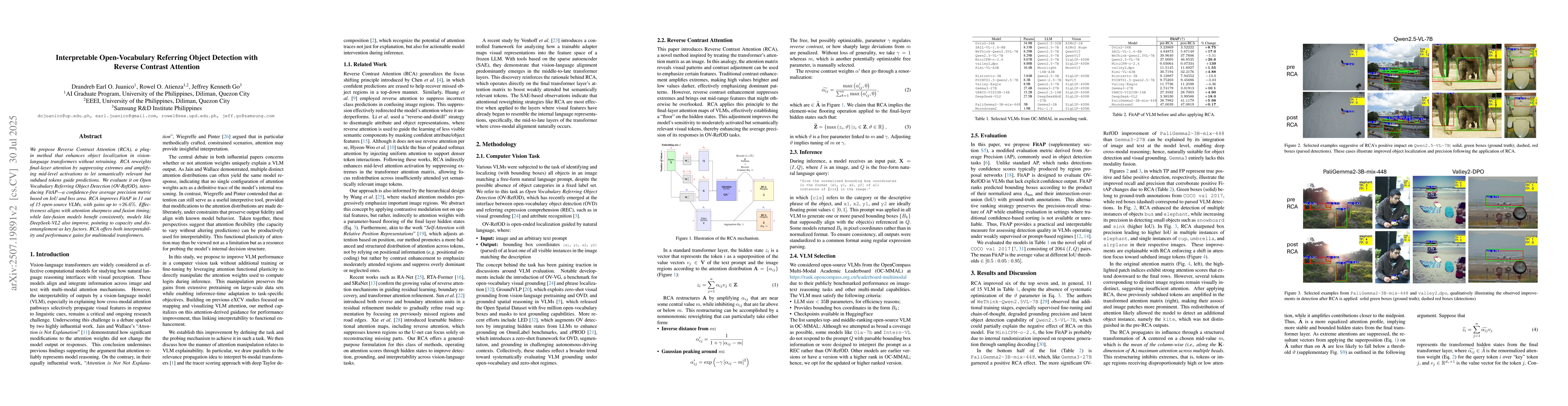 We propose Reverse Contrast Attention (RCA), a plug-in method that enhances object localization in vision-language transformers without retraining. RCA reweights final-layer attention by suppressing extremes and amplifying mid-level activations to let semantically relevant but subdued tokens guide predictions. We evaluate it on Open Vocabulary Referring Object Detection (OV-RefOD), introducing FitAP, a confidence-free average precision metric based on IoU and box area. RCA improves FitAP in 11 out of 15 open-source VLMs, with gains up to $+26.6\%$. Effectiveness aligns with attention sharpness and fusion timing; while late-fusion models benefit consistently, models like $\texttt{DeepSeek-VL2}$ also improve, pointing to capacity and disentanglement as key factors. RCA offers both interpretability and performance gains for multimodal transformers.