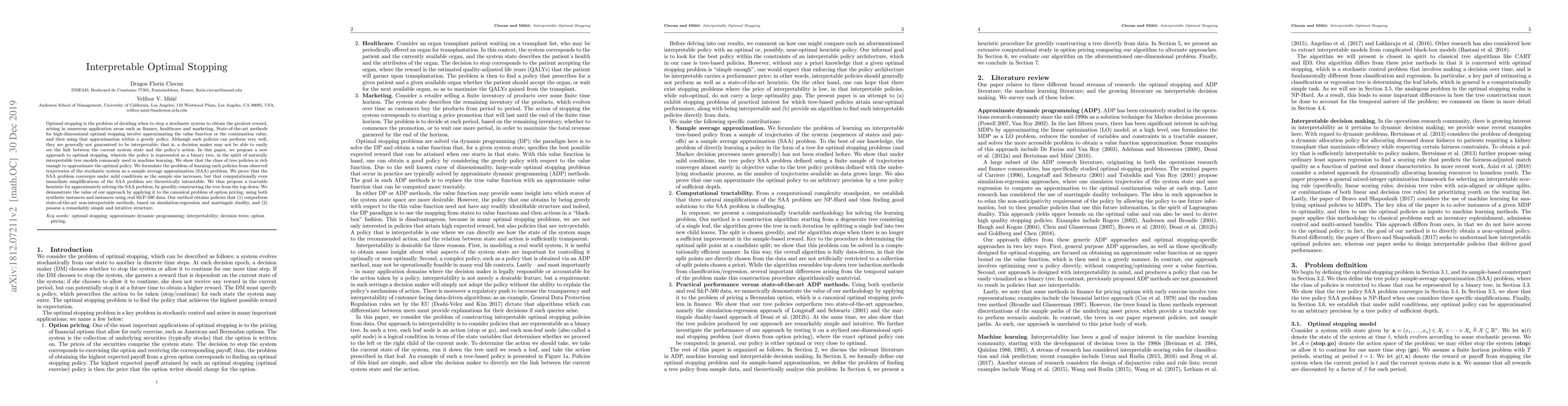 Optimal stopping is the problem of deciding when to stop a stochastic system to obtain the greatest reward, arising in numerous application areas such as finance, healthcare and marketing. State-of-the-art methods for high-dimensional optimal stopping involve approximating the value function or the continuation value, and then using that approximation within a greedy policy. Although such policies can perform very well, they are generally not guaranteed to be interpretable; that is, a decision maker may not be able to easily see the link between the current system state and the policy's action. In this paper, we propose a new approach to optimal stopping, wherein the policy is represented as a binary tree, in the spirit of naturally interpretable tree models commonly used in machine learning. We show that the class of tree policies is rich enough to approximate the optimal policy. We formulate the problem of learning such policies from observed trajectories of the stochastic system as a sample average approximation (SAA) problem. We prove that the SAA problem converges under mild conditions as the sample size increases, but that computationally even immediate simplifications of the SAA problem are theoretically intractable. We thus propose a tractable heuristic for approximately solving the SAA problem, by greedily constructing the tree from the top down. We demonstrate the value of our approach by applying it to the canonical problem of option pricing, using both synthetic instances and instances using real S&P-500 data. Our method obtains policies that (1) outperform state-of-the-art non-interpretable methods, based on simulation-regression and martingale duality, and (2) possess a remarkably simple and intuitive structure.