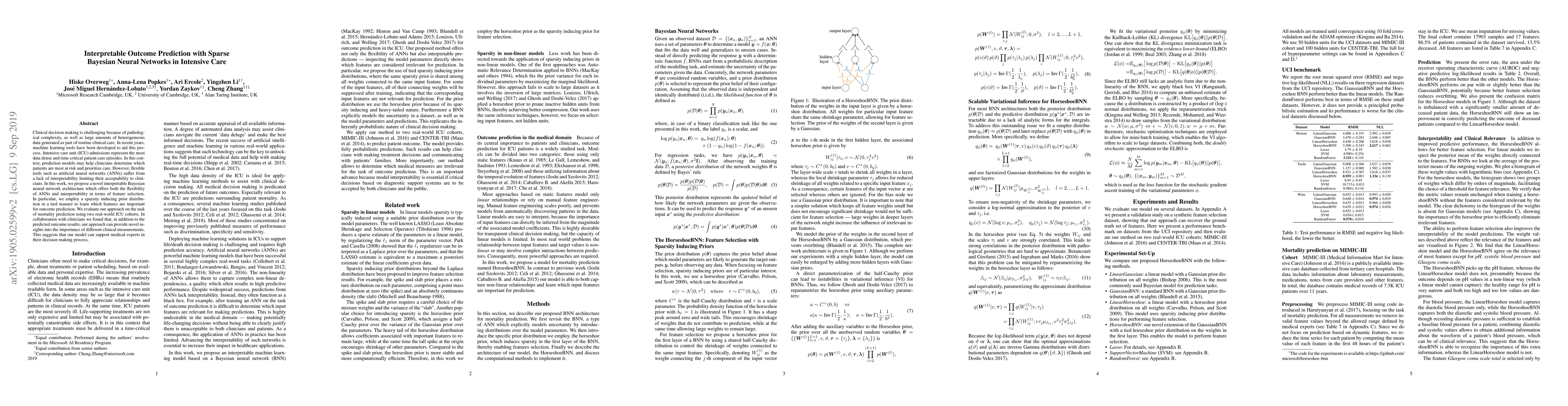 Clinical decision making is challenging because of pathological complexity, as well as large amounts of heterogeneous data generated as part of routine clinical care. In recent years, machine learning tools have been developed to aid this process. Intensive care unit (ICU) admissions represent the most data dense and time-critical patient care episodes. In this context, prediction models may help clinicians determine which patients are most at risk and prioritize care. However, flexible tools such as artificial neural networks (ANNs) suffer from a lack of interpretability limiting their acceptability to clinicians. In this work, we propose a novel interpretable Bayesian neural network architecture which offers both the flexibility of ANNs and interpretability in terms of feature selection. In particular, we employ a sparsity inducing prior distribution in a tied manner to learn which features are important for outcome prediction. We evaluate our approach on the task of mortality prediction using two real-world ICU cohorts. In collaboration with clinicians we found that, in addition to the predicted outcome results, our approach can provide novel insights into the importance of different clinical measurements. This suggests that our model can support medical experts in their decision making process.