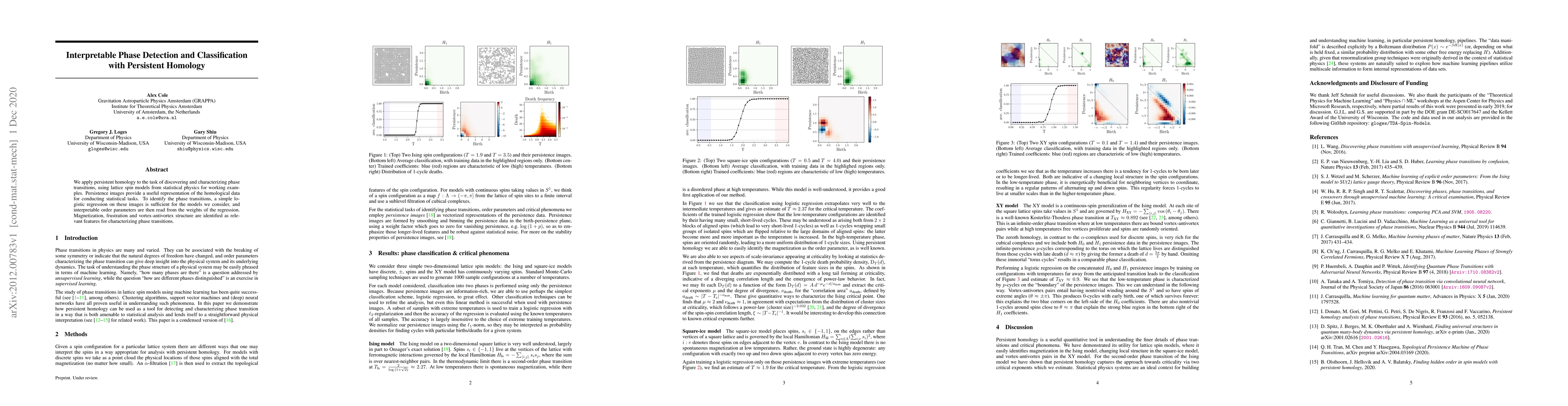 This paper uses persistent homology to detect and classify phase transitions in lattice spin models, employing persistence images for statistical analysis. Logistic regression on these images identifies phase transitions, with interpretable order parameters derived from regression weights, highlighting magnetization, frustration, and vortex-antivortex structures.