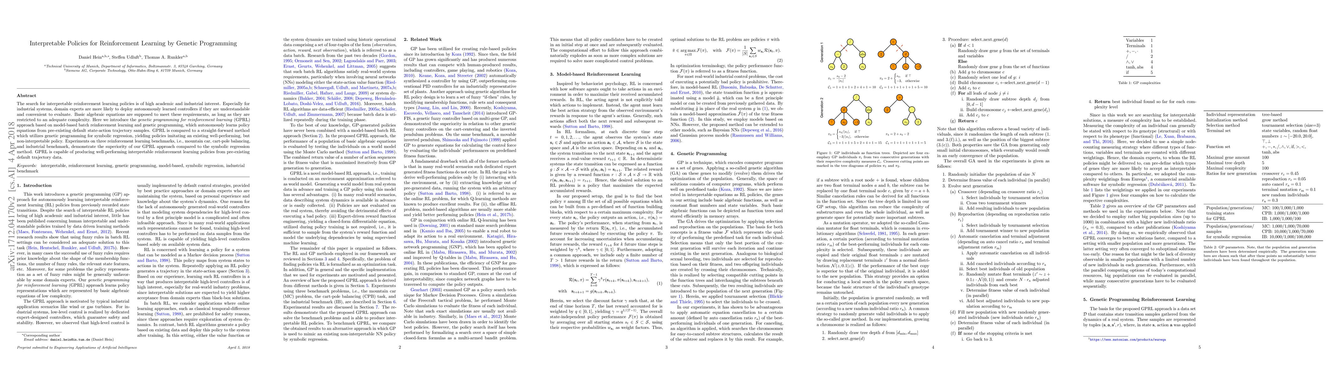 The search for interpretable reinforcement learning policies is of high academic and industrial interest. Especially for industrial systems, domain experts are more likely to deploy autonomously learned controllers if they are understandable and convenient to evaluate. Basic algebraic equations are supposed to meet these requirements, as long as they are restricted to an adequate complexity. Here we introduce the genetic programming for reinforcement learning (GPRL) approach based on model-based batch reinforcement learning and genetic programming, which autonomously learns policy equations from pre-existing default state-action trajectory samples. GPRL is compared to a straight-forward method which utilizes genetic programming for symbolic regression, yielding policies imitating an existing well-performing, but non-interpretable policy. Experiments on three reinforcement learning benchmarks, i.e., mountain car, cart-pole balancing, and industrial benchmark, demonstrate the superiority of our GPRL approach compared to the symbolic regression method. GPRL is capable of producing well-performing interpretable reinforcement learning policies from pre-existing default trajectory data.